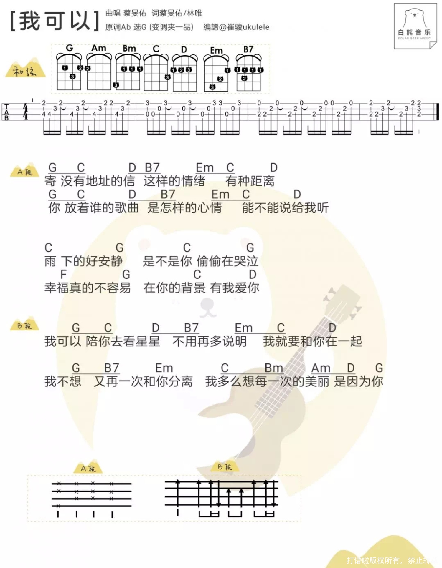曲谱介绍: 蔡旻佑《我可以》_G调尤克里里谱