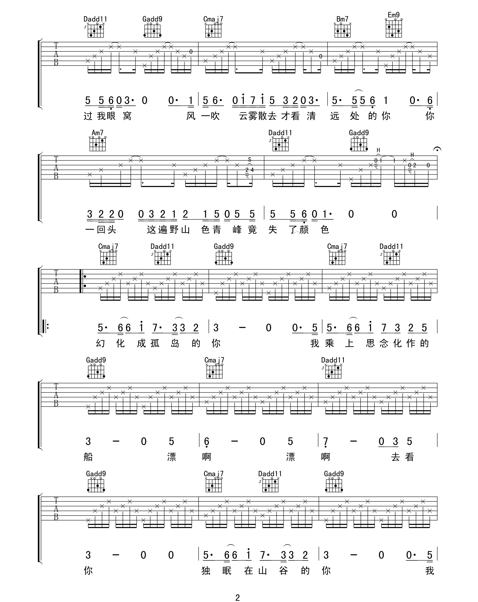 曲谱介绍: 山下吉他谱_方拾贰_《山下》G调原版弹唱六线谱_高清图片谱分享,《山下》是由方拾贰演唱的一首民谣歌曲。我能为你做的最大胆的事,不是因寻你不得削发为僧;而是即使遁入空门,在得知你孤身一人的消息之后,翻山越岭跨越江河,去陪你。 这首歌原调为#G调,此版本的曲谱采用G调指法根据原版进行编配,演唱时夹变调夹1品即可回到原调。整首歌节奏和弦使用比较简单,在节奏方面需要多注意带附点的节奏,其他都比较常规。 山下吉他谱_方拾贰_《山下》G调原版弹唱六线谱_高清图片谱1: