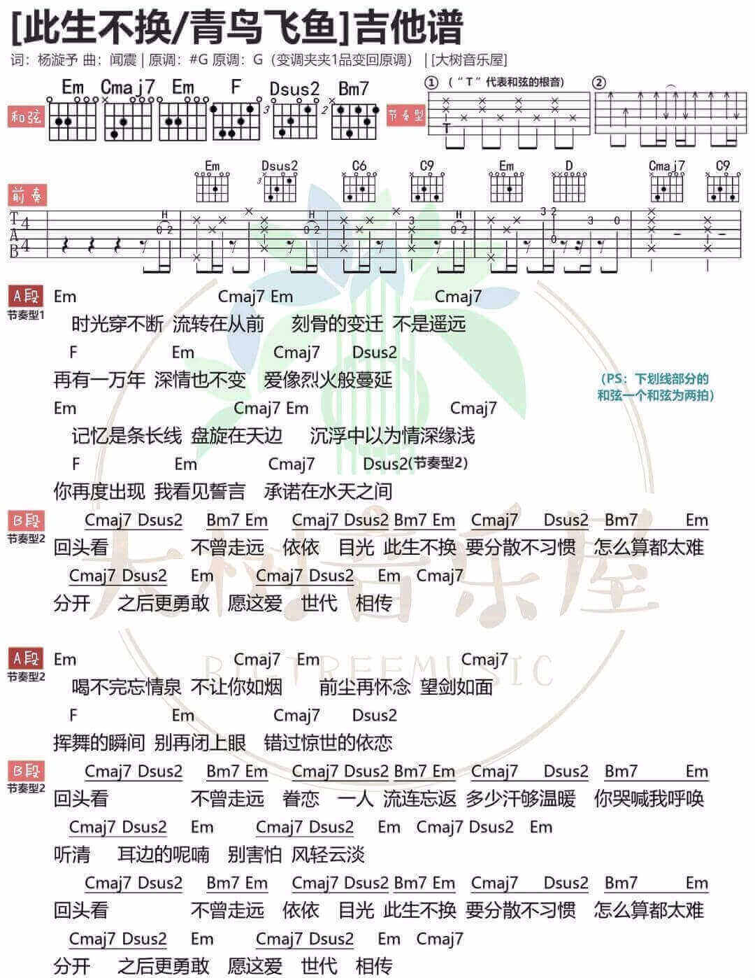 曲谱介绍: 《此生不换》吉他谱_青鸟飞鱼_G调原版弹唱谱_高清和弦图谱分享,《此生不换》这首歌曲作为《仙剑奇侠传三》的插曲,将电视剧中角色千年不灭的感情刻画的淋漓尽致,紫萱和徐长卿几世纠缠,龙葵等待兄长千年,夕瑶等待飞蓬千年,令人印象深刻。 此版本的曲谱来源于大树音乐屋扒谱制谱,歌曲原调为#G调,这里采用G调指法根据原版进行编配。虽然谱子是和弦图形式的谱但前奏和各个部分的指法节奏型都标注的非常清楚,很精华。 《此生不换》吉他谱_青鸟飞鱼_G调原版弹唱谱_高清和弦图谱: