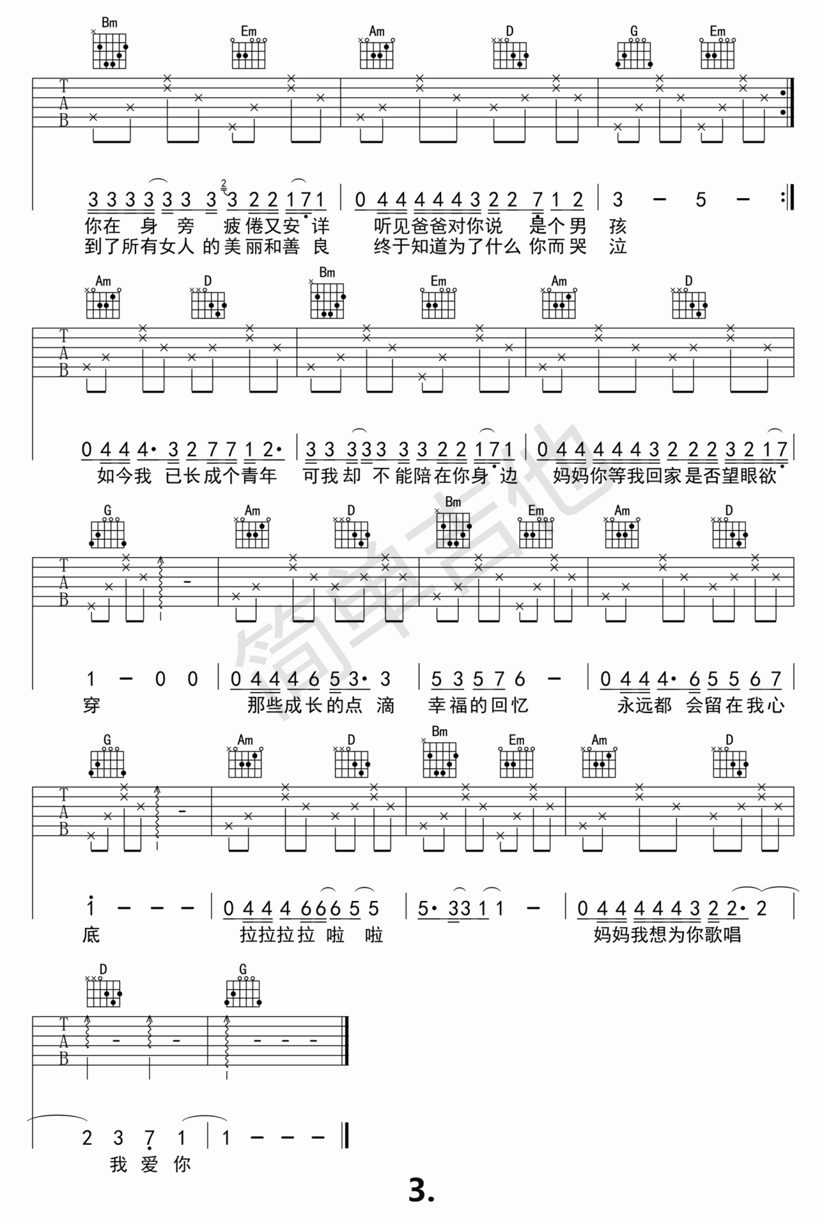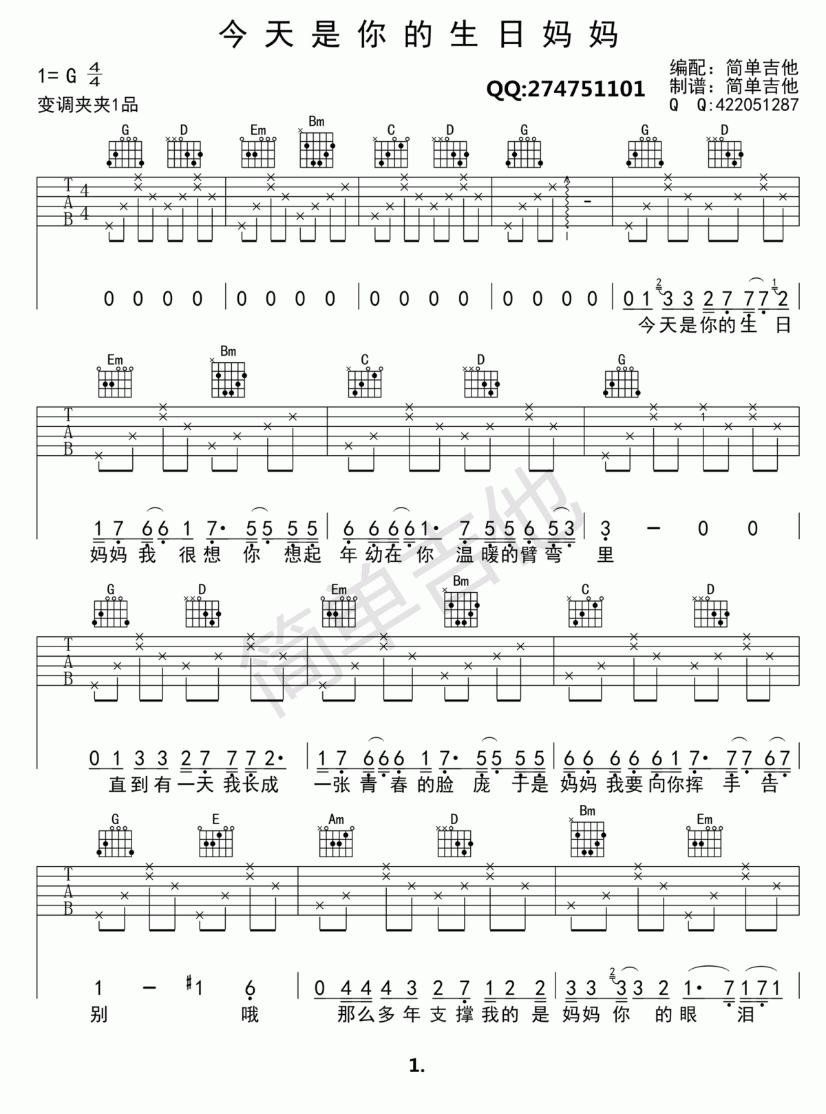 曲谱介绍: 《今天是你的生日妈妈》吉他弹唱谱,采用G调指法编配,共有3张高清图谱。