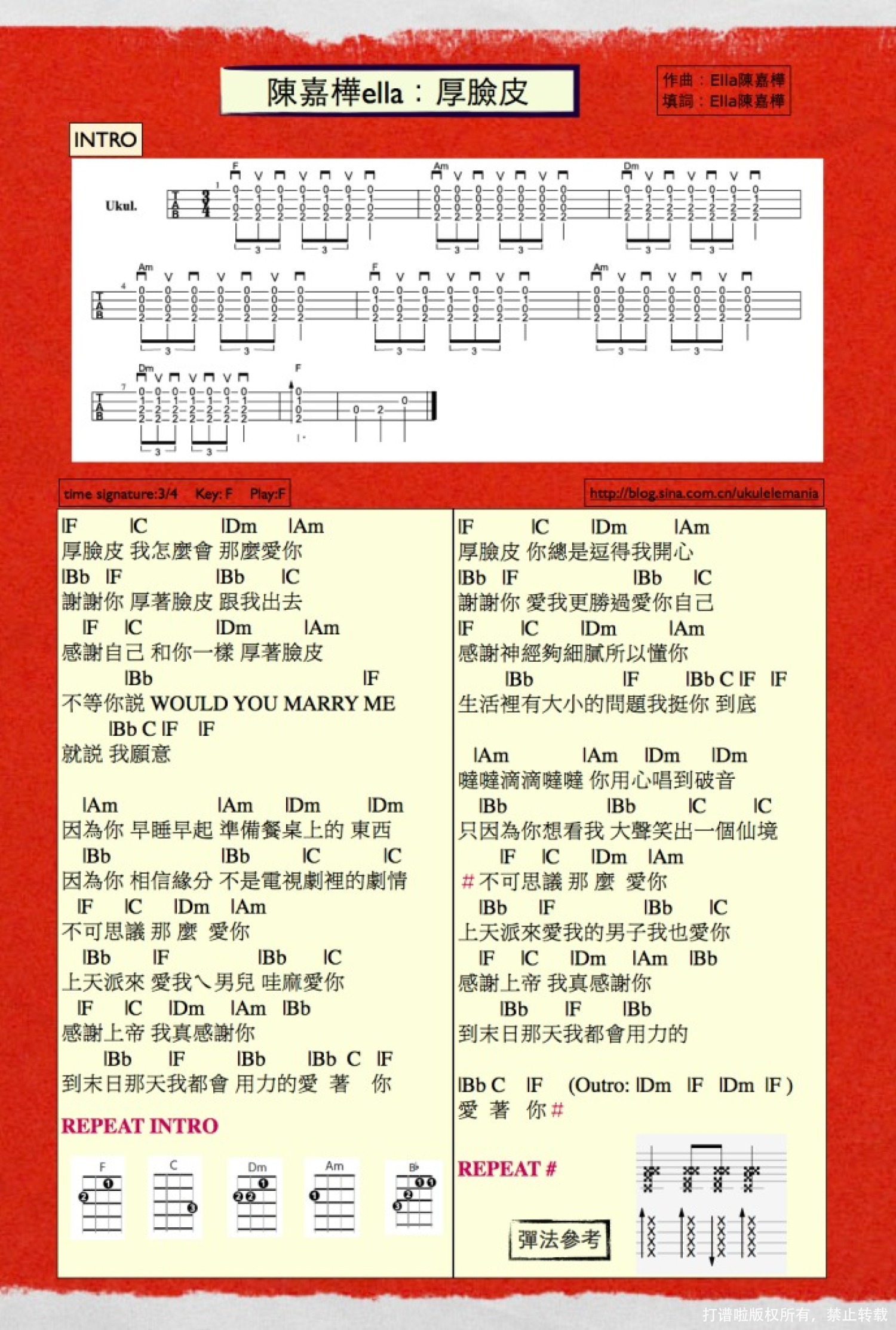 曲谱介绍: Ella陈嘉桦《厚脸皮》_F调尤克里里谱