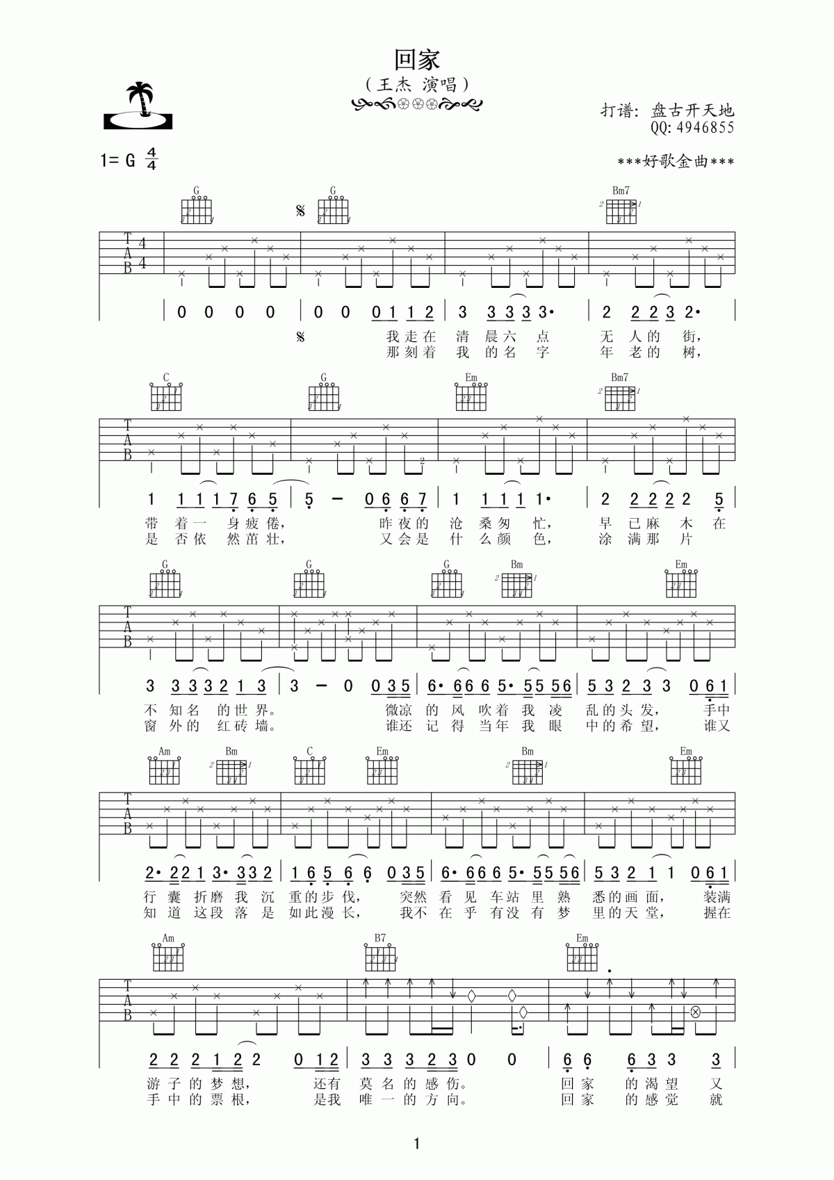 曲谱介绍: 王杰《回家》吉他弹唱谱,采用G调指法编配,共有2张高清图谱,免翻页排版设计。