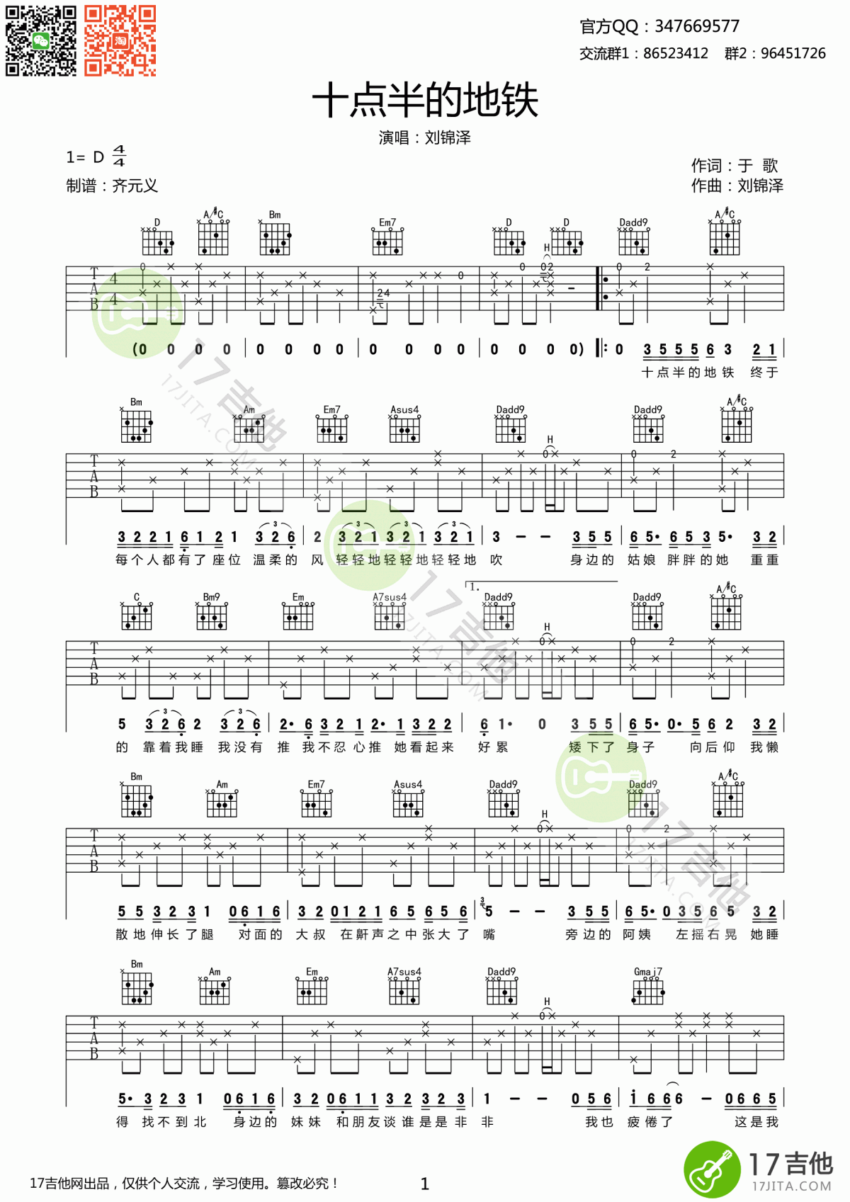 十点半的地铁吉他谱 - 刘锦泽 - D调吉他弹唱谱