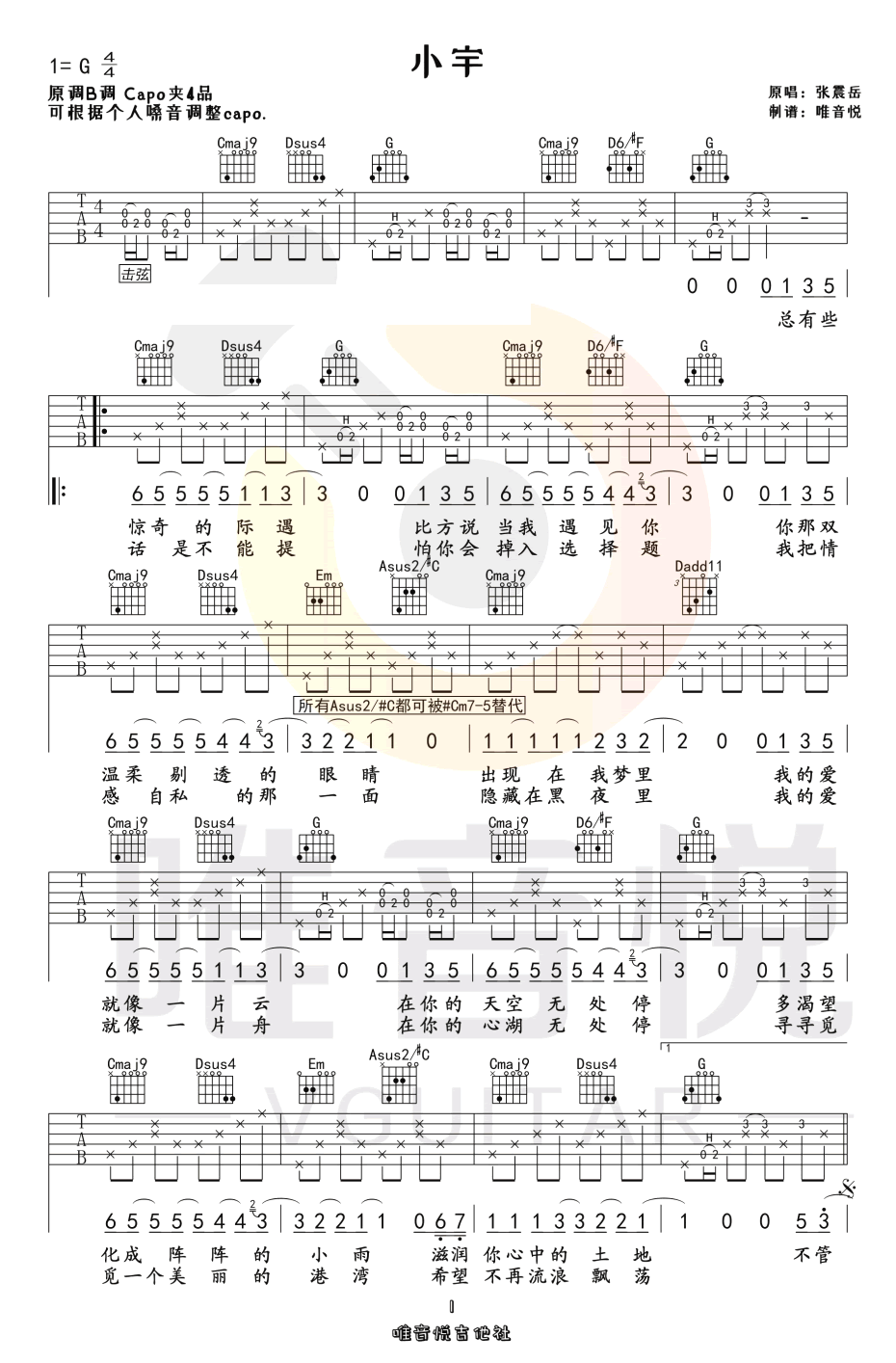 曲谱介绍: 小宇吉他谱_张震岳_《小宇》G调简单版弹唱六线谱_高清图片谱分享,《小宇》是由张震岳创作并演唱的一首老情歌。《小宇》平淡简单的节奏容易让人回味过去和现在的生活,生活里总会有惊奇的奇遇,比方说当我遇见你,那双温柔剔透的双眸,曾经出现在我的梦境。 此版本的曲谱来源于唯音悦吉他社扒谱制谱,歌曲原调为B调,这里采用了G调指法根据原版进行编配,演唱时夹变调夹4品回到原调。这首歌编配比较随原版,指法有一定难度,主要在于其中的击勾弦,但节奏型都是十分简单的。 小宇吉他谱_张震岳_《小宇》G调简单版弹唱六线谱_高清图片谱1: