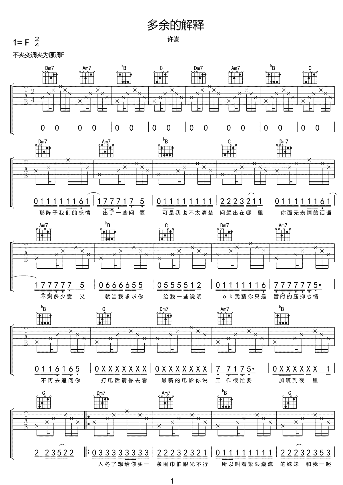 曲谱介绍: 《多余的解释》吉他谱_许嵩_F调原版弹唱六线谱_高清图片谱分享,《多余的解释》是由许嵩作词作曲并演唱的一首歌,当信任出现了缺口,就再也难以愈合了吧。而在这歌中许嵩也用他独特的方式给我们展示了,由希望失望绝望的感情色彩变化。 此版本的曲谱来源于网络搜集,版权归原作者所有。这里歌曲采用F调指法根据原版进行编配,演唱时可以根据自己的嗓音情况夹变调夹。这首歌练习的难点在于F调的几个大横按和弦,另外这个谱中的节奏型不是太好把握,可以多听原曲。 《多余的解释》吉他谱_许嵩_F调原版弹唱六线谱_高清图片谱: