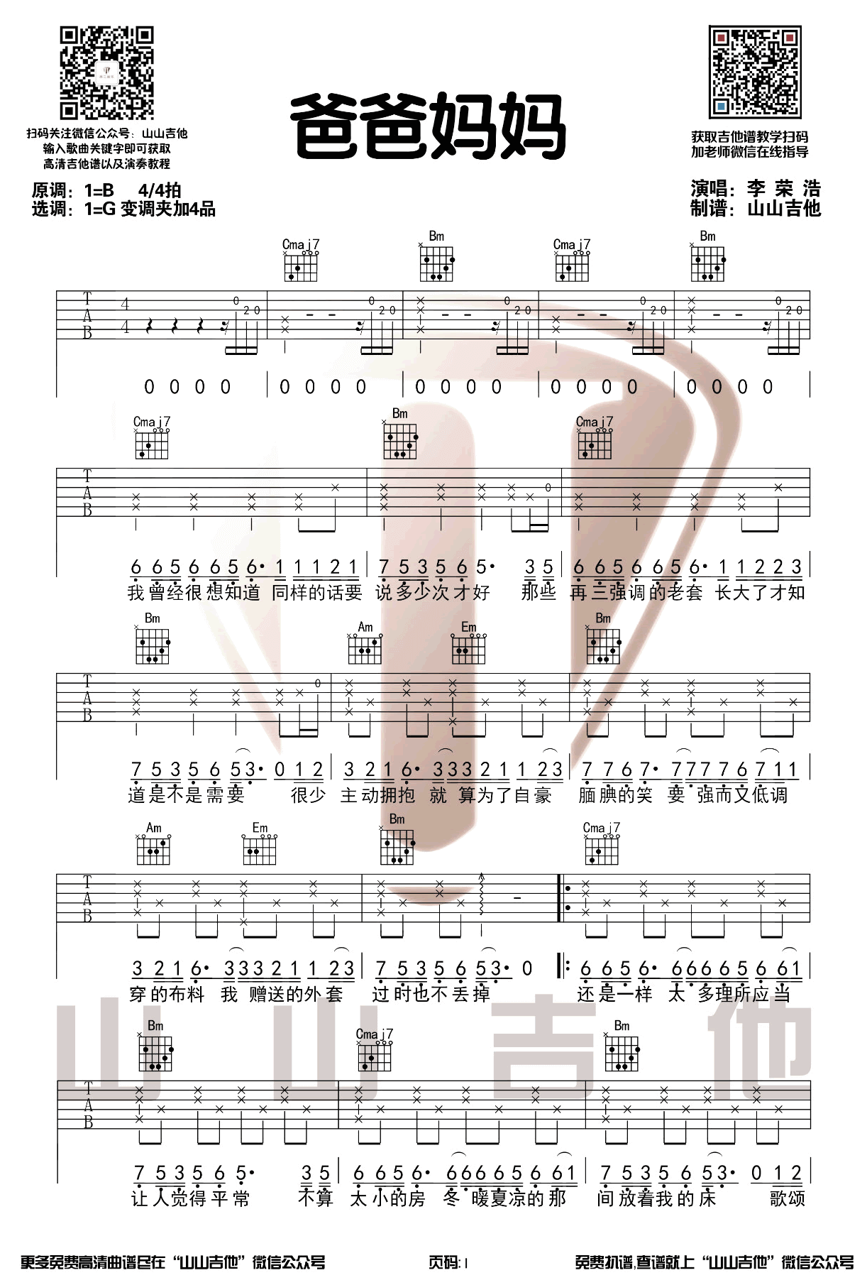 曲谱介绍: 《爸爸妈妈》吉他谱_李荣浩_G调弹唱六线谱_高清图片谱分享,《爸爸妈妈》是李荣浩创作并演唱的一首歌曲。李荣浩唱的这首歌满满都是亲情,都是让人下泪感动。他唱出了爸爸妈妈的用心良苦,凡事再三叮嘱,你也别嫌他们啰嗦,他们给了我们不少不多,足够我们在这个年代奔波。