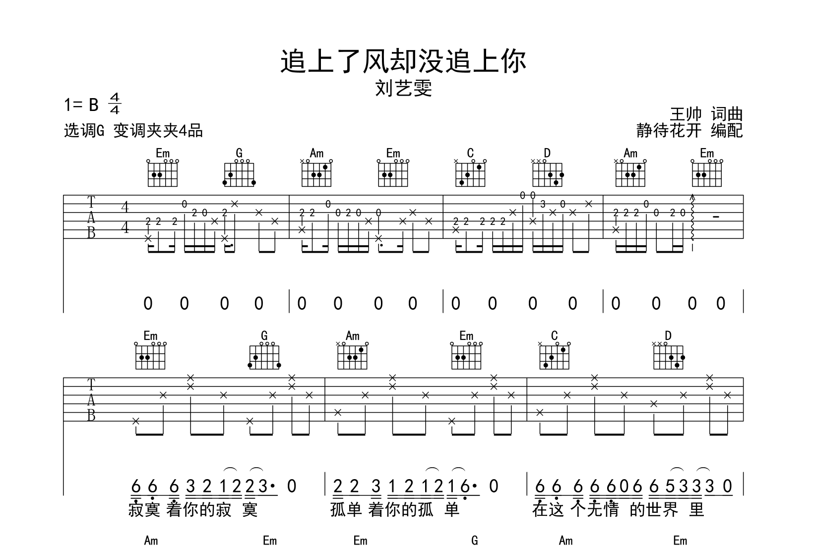 曲谱介绍: 追上了风却没追上你吉他谱,刘艺雯演唱,本吉他谱采用G调指法编配,来自@静待花开编配制作,变调夹夹第4品演奏,原调B调,也可以根据个人嗓音条件灵活选择变调夹,演奏的速度控制在每分钟70拍左右,演奏难度简单。