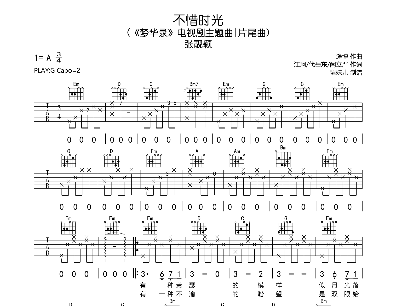 曲谱介绍: 不惜时光吉他谱,张靓颖演唱,《梦华录》电视剧主题曲|片尾曲,本谱采用G调指法编配,弹唱建议变调夹2品,速度85BPM,节奏3/4拍,难度较简单。由珺妹儿制谱。