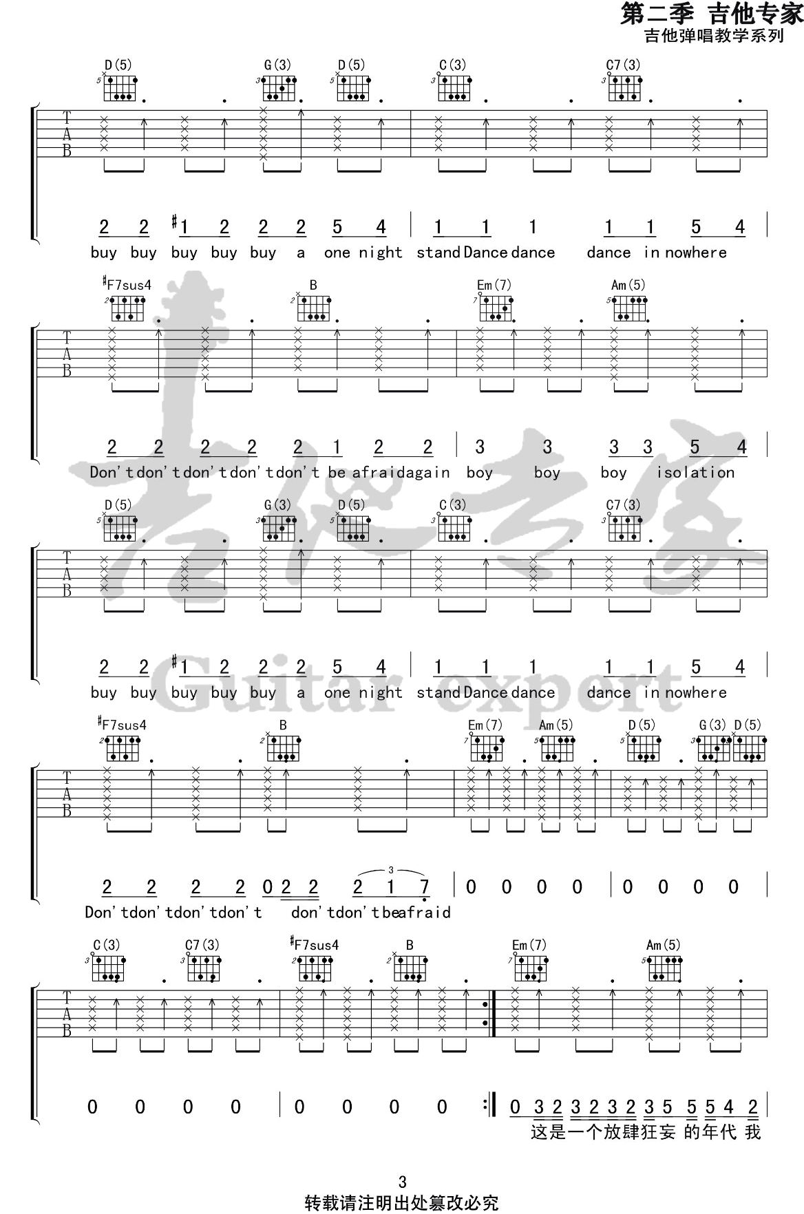 曲谱介绍: 《男孩别哭》吉他谱_海龟先生_G调原版六线谱_高清图片谱分享,《男孩别哭》是由海龟先生演唱的一首歌。讲述了漂泊异乡的寂寞男孩,渴望在大城市里能找到一席之地,安放他们热情悸动的心。这个男孩是你,是他,或许就是海龟先生。 此版本的曲谱来源于音艺吉他专家扒谱制谱,这里歌曲采用G调指法根据原版进行编配,演唱时可根据自己的嗓音情况夹变调夹。这首歌采用反拍切弦,全都采用大横按,而且唱很难融合进伴奏,所以练习起来有一定难度。 《男孩别哭》吉他谱_海龟先生_G调原版六线谱_高清图片谱1-2: