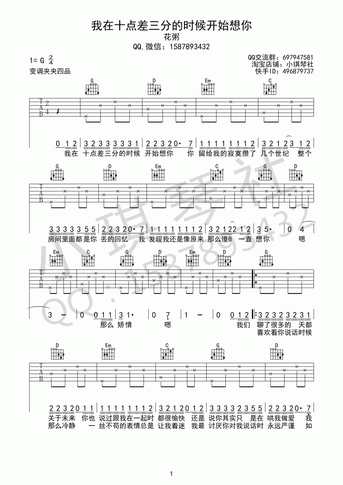 我在十点差三分的时候开始想你_G调吉他谱 - 我在十点差三分的时候开始想你 - G调吉他弹唱谱