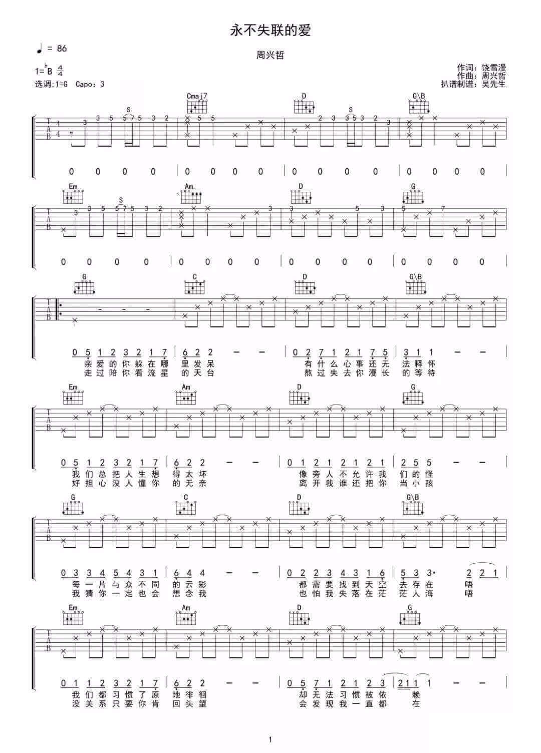 曲谱介绍: 《永不失联的爱》吉他谱_周兴哲_G调原版弹唱六线谱_图片谱分享,《永不失联的爱》这首歌由台湾歌手周兴哲作曲并演唱,曾经作为戏剧《小妖的金色城堡》的主题曲,而其中的歌词,由著名作家饶雪漫填词。此版本的曲谱来源于网络,采用G调指法原版编配,演唱时夹变调夹3品,整体难度不大,简单易学又好听。 《永不失联的爱》吉他谱_周兴哲_G调原版弹唱六线谱_图片谱1: