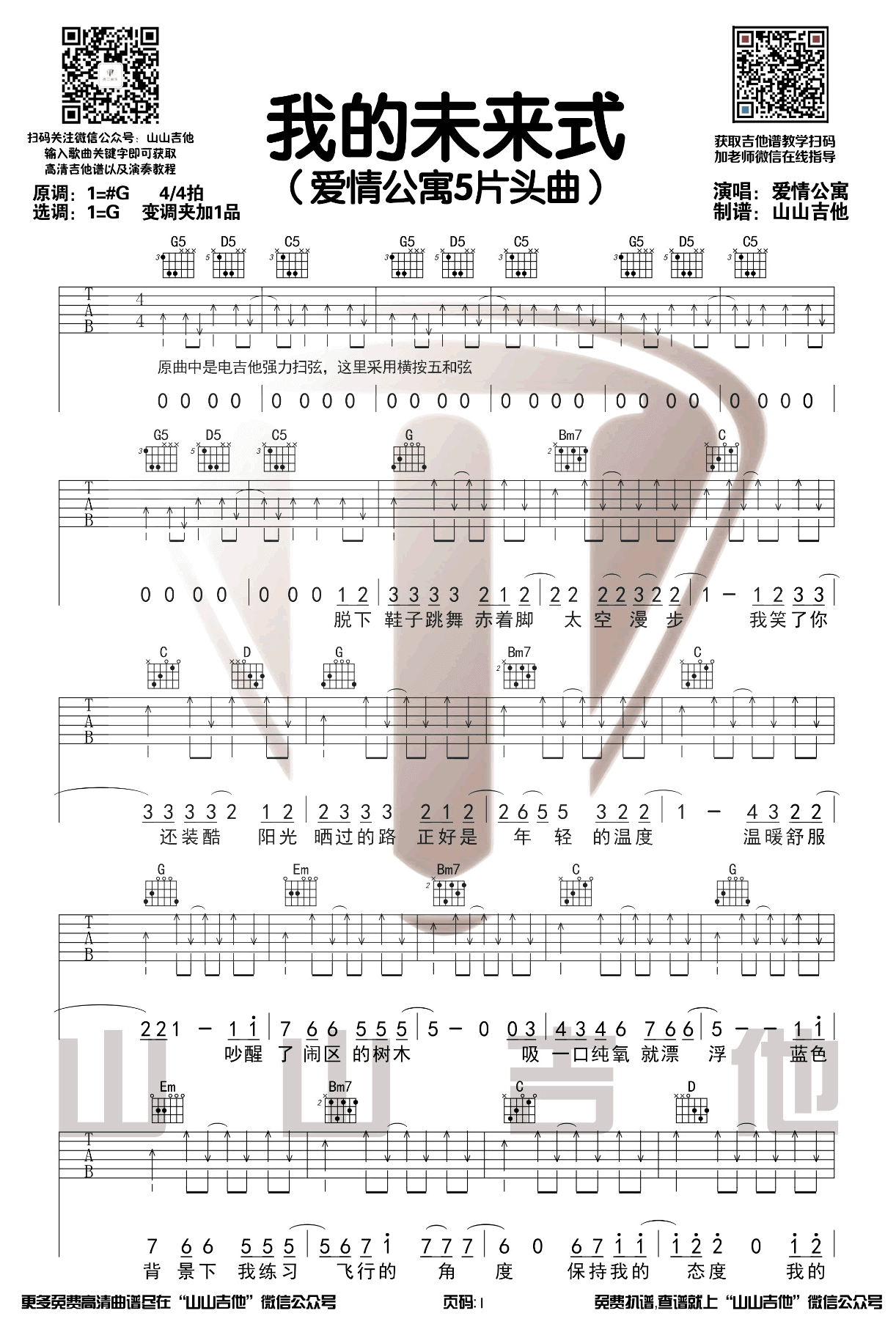 曲谱介绍: 《我的未来式》吉他谱_郭采洁/陈每文_G调扫弦版弹唱六线谱分享,《我的未来式》是郭采洁演唱的一首歌,这首歌同时也是电视剧《爱情公寓》的主题曲。这首歌以轻快的旋律、俏皮的歌词贯穿了整整五部电视剧,且成功印入每个观众脑海里。每当这首歌曲响起,我们就知道新的欢乐如期而至,青春的回忆也席卷而来。“我的未来式由我做主”不仅仅是一句歌词,还展现着主角们自由的人生态度,不管他们的性格差异如何,主角们一直随性的选择自己的职业,爱情,友情。