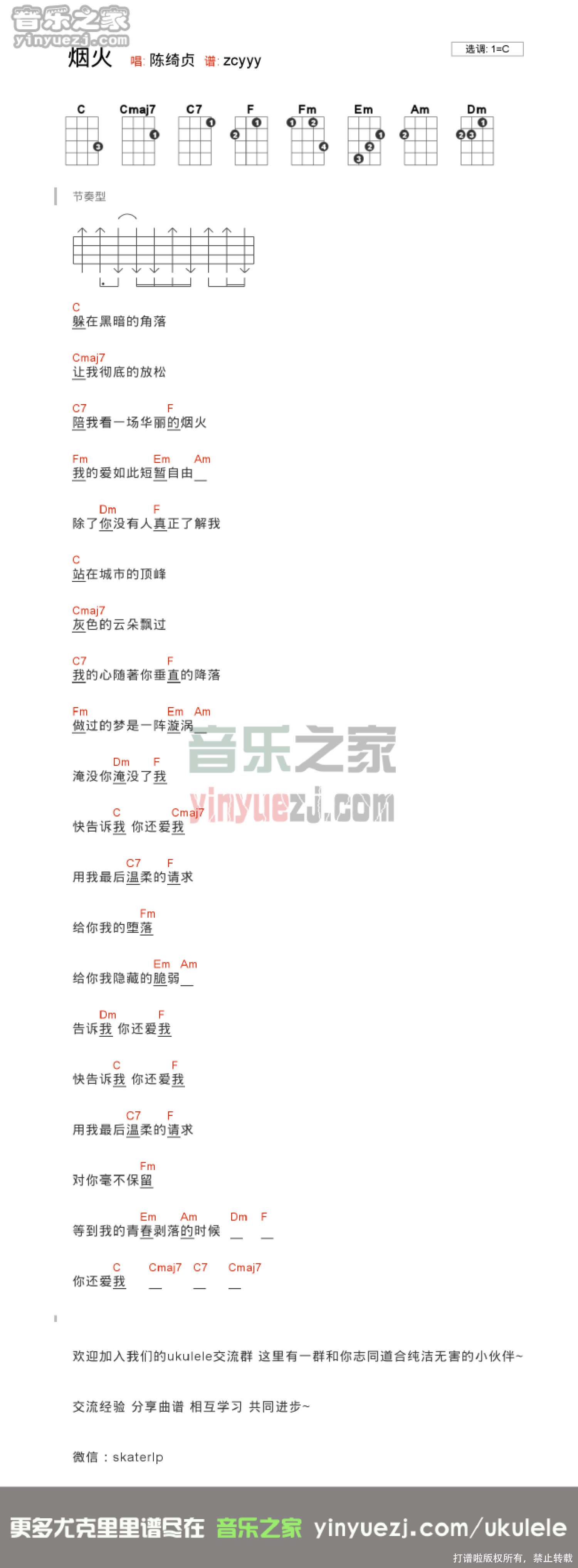 曲谱介绍: 陈绮贞《烟火》_C调尤克里里谱