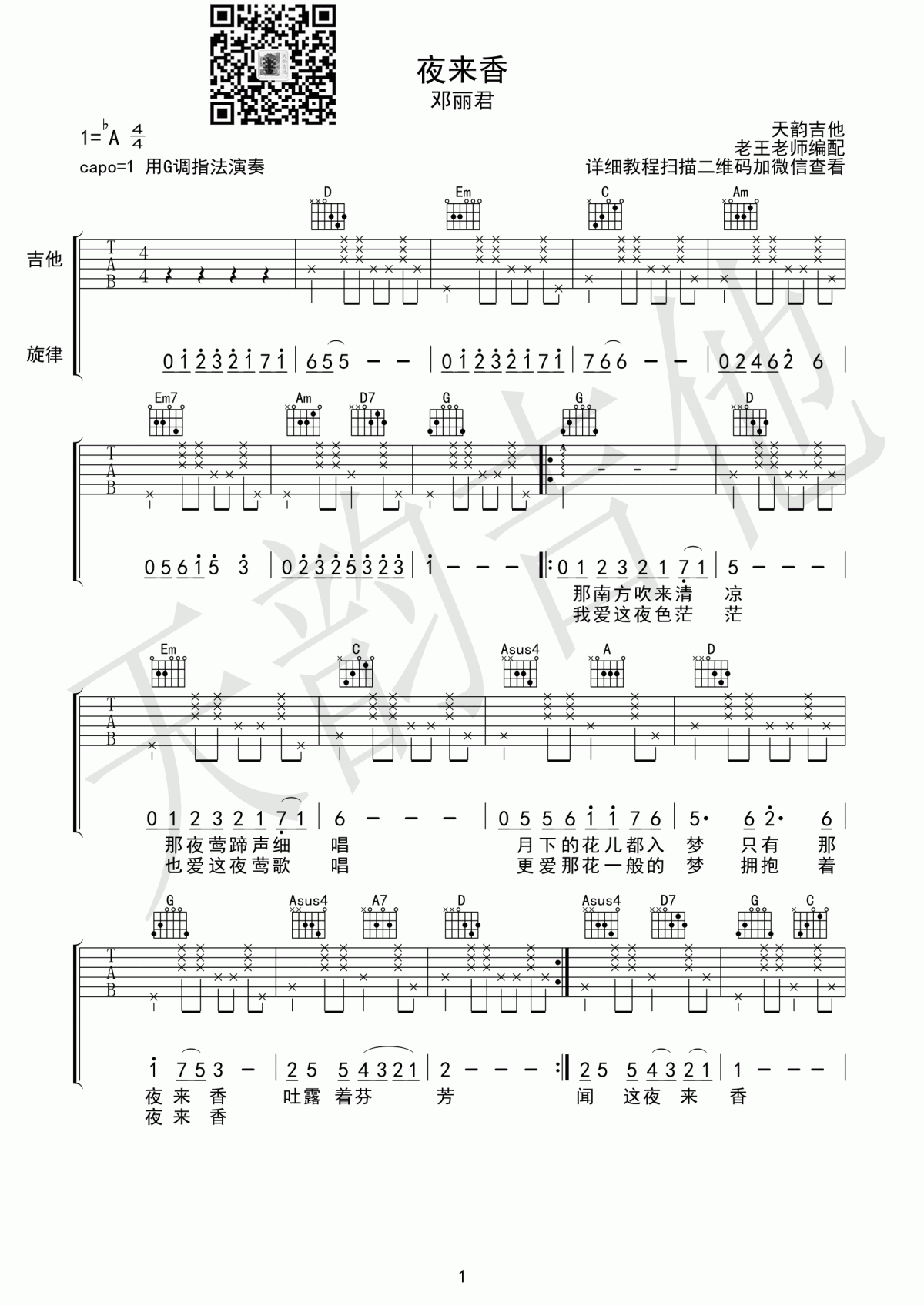 曲谱介绍: 邓丽君《夜来香》吉他谱,原调bA,用G调指法演奏,Capo夹一品。一首金黄的老歌,邓丽君温柔而优美的歌,宛如一股夜香,让人陶醉。有时生活需要这样的闲暇,让身心疲惫的人在这轻柔的旋律中完全放松。