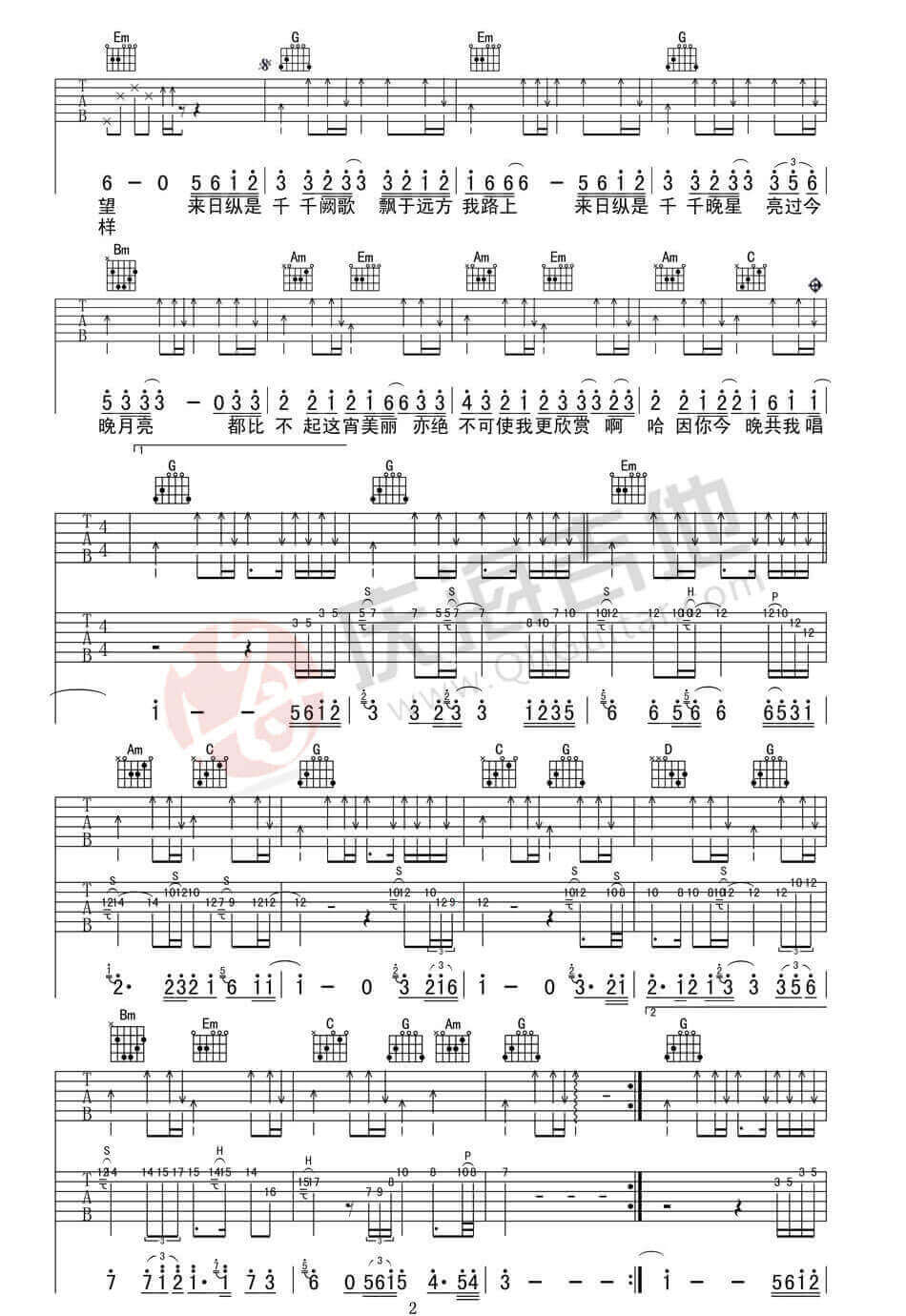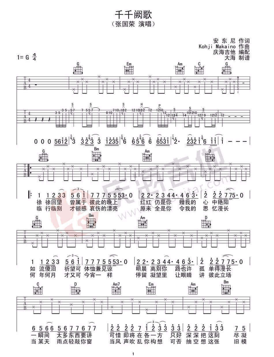 曲谱介绍: 《千千阙歌》吉他谱_张国荣_G调双吉他版弹唱谱_高清六线谱分享,《千千阙歌》这首歌原唱为陈慧娴,是一首超级经典的粤语歌曲,有过非常多的翻唱版本,张国荣演唱的这个版本本人是比较喜欢的。 此版本的曲谱来源于庆海吉他扒谱制谱,歌曲采用G调指法根据张国荣版本进行编配。这里为双吉他版本的曲谱,副歌部分的扫弦可以采用A段的分解伴奏,或改为简单扫弦节奏。 《千千阙歌》吉他谱_张国荣_G调双吉他版弹唱谱_高清六线谱1:
