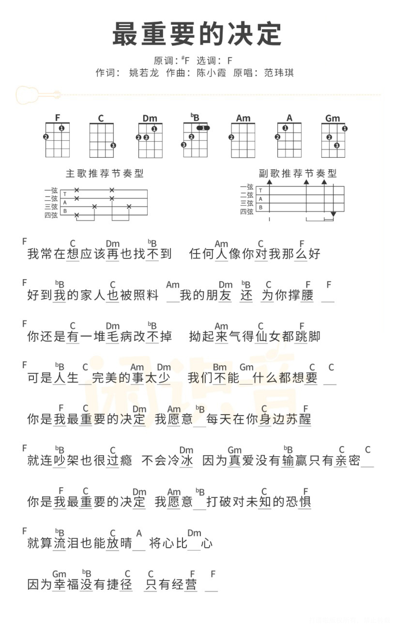 曲谱介绍: 范玮琪《最重要的决定》_F调尤克里里谱