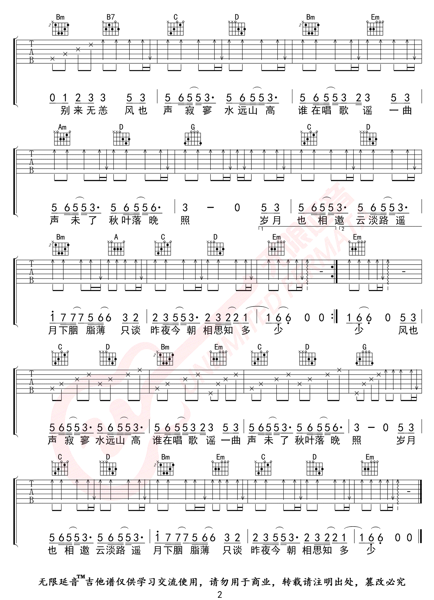 曲谱介绍: 云水谣吉他谱_En_《云水谣》G调原版弹唱六线谱_高清图片谱分享,《云水谣》是由En在今年7月份发布的一首古风类单曲,歌词写得非常美。余温散尽的夕阳,天地间走了一趟,跋山涉水后落个停当,是你摊开了我手掌,留下了咿咿呀呀的轻唱,将爱恨别离都深藏。 此版本的曲谱来源于无限延音扒谱制谱,歌曲原调为降A调,这里采用了G调指法根据原版进行编配,演唱时夹变调夹1品回到原调。这首歌编配难度不大,歌曲前半部分采用分解和弦,后面采用简单的扫弦节奏型,比较容易练习。 云水谣吉他谱_En_《云水谣》G调原版弹唱六线谱_高清图片谱1: