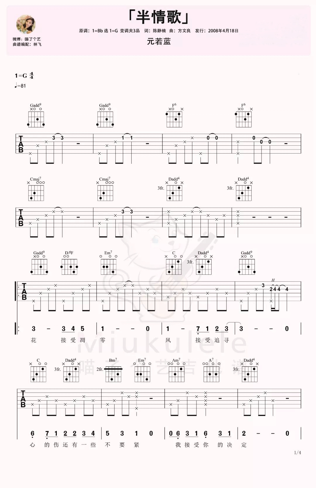 曲谱介绍: 《半情歌》吉他谱_元若蓝_G调原版弹唱六线谱_高清图片谱分享,《半情歌》是电视剧《命中注定我爱你》的插曲,由元若蓝演唱,这首歌也是最令人动心怜悯的情歌,元若蓝突破自我,歌声里的忧伤隐含着坚强,道出便利贴女孩酸苦却又动人的心声,让人不忍忽视。大家听这首歌曲,会不会联想到《孤单北半球》和《心愿便利贴》?其实这两首歌就是同一个人写的。