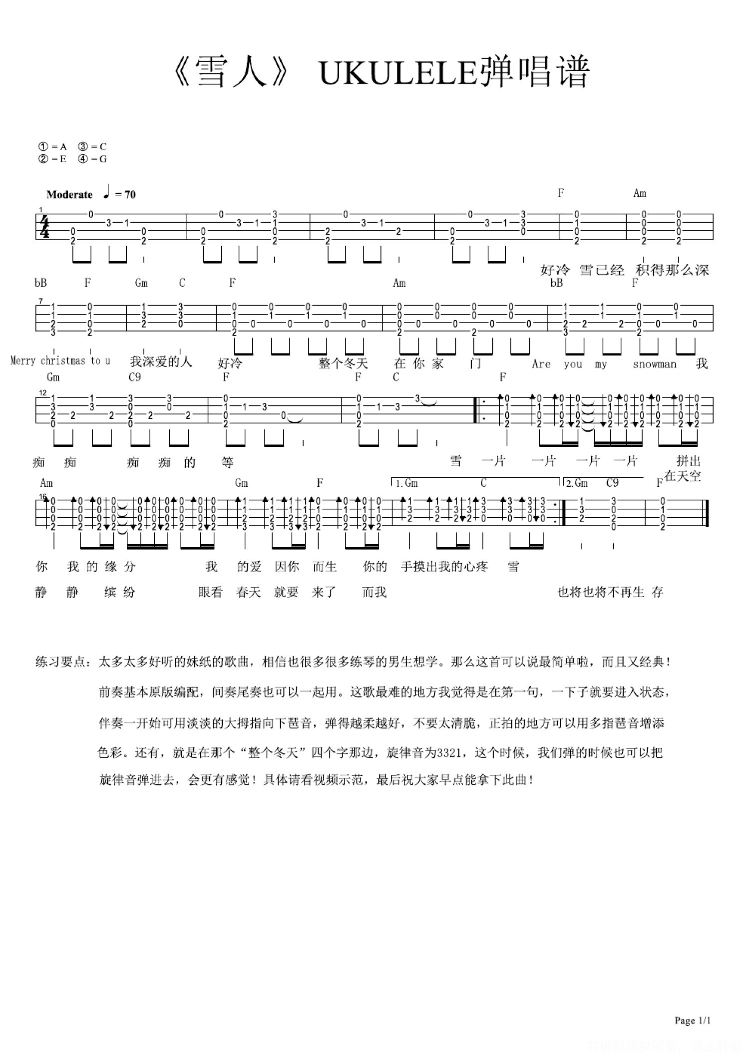 曲谱介绍: 《雪人》_C调尤克里里谱