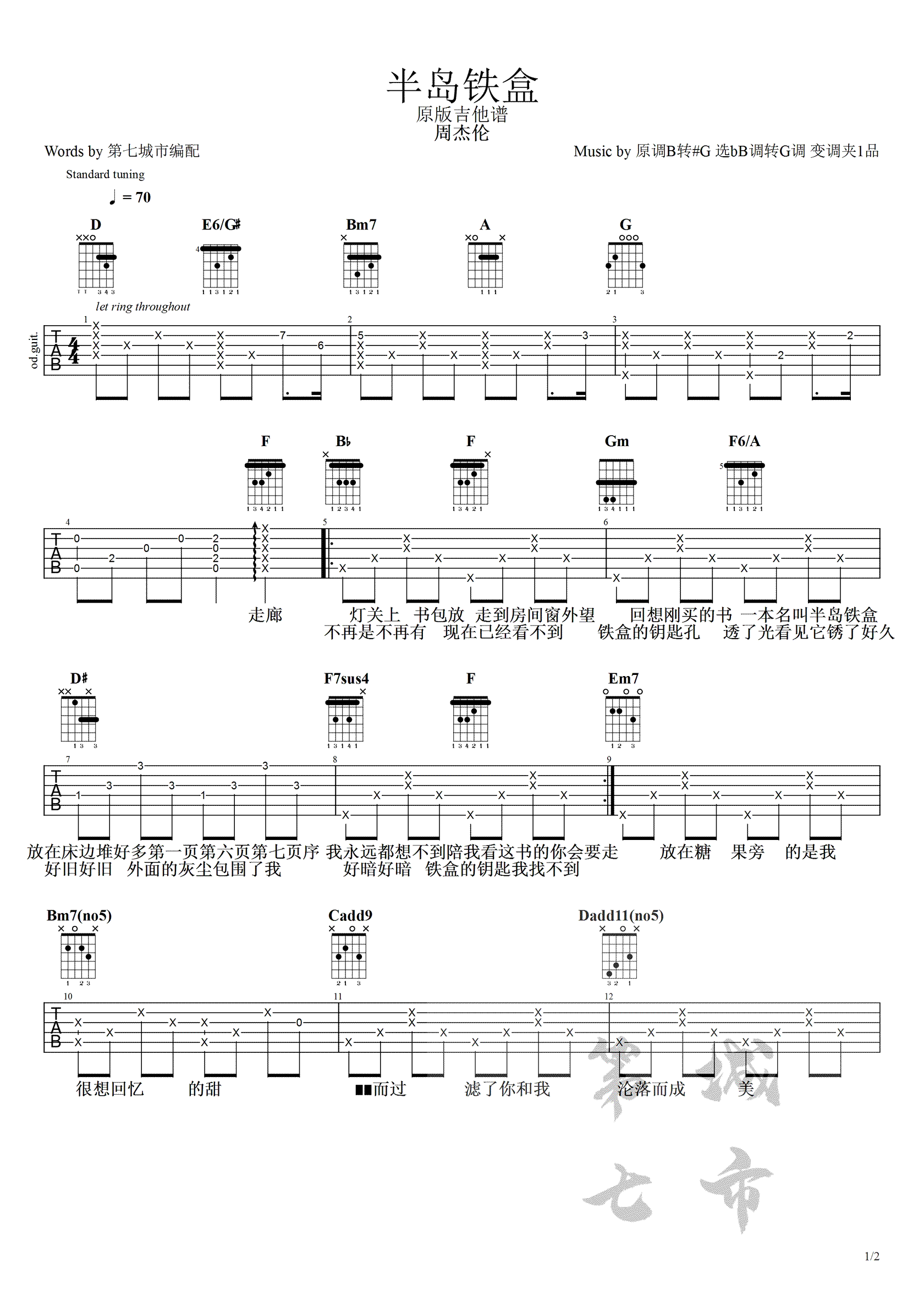 曲谱介绍: 《半岛铁盒》吉他谱_周杰伦_D调原版弹唱六线谱_高清图片谱分享,《半岛铁盒》是由周杰伦演唱的一首歌曲,由周杰伦作词、作曲,林迈可编曲。