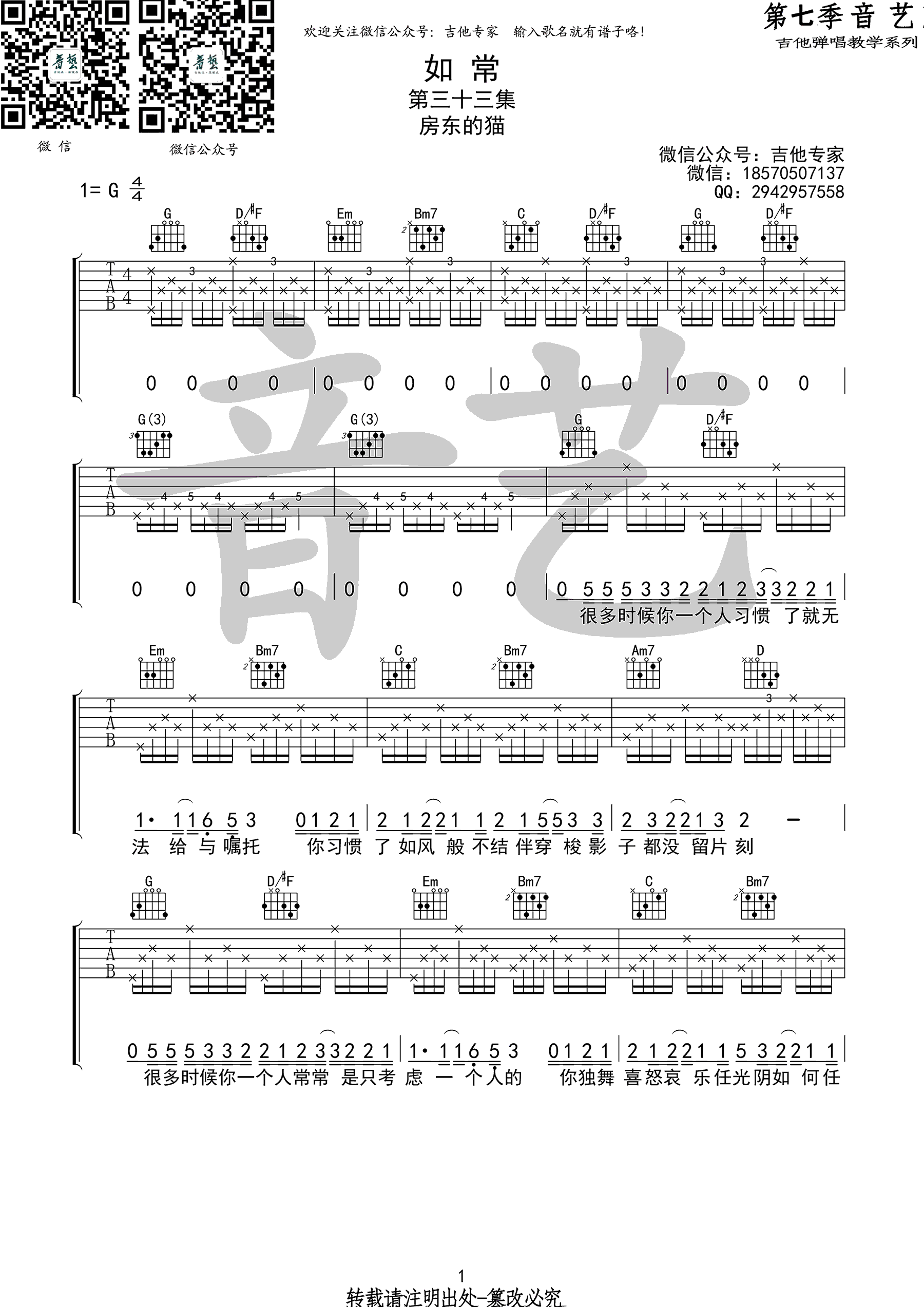 曲谱介绍: 如常吉他谱_房东的猫_《如常》G调弹唱六线谱_高清图片谱分享,《如常》是由房东的猫演唱的一首歌,由少年佩作曲。