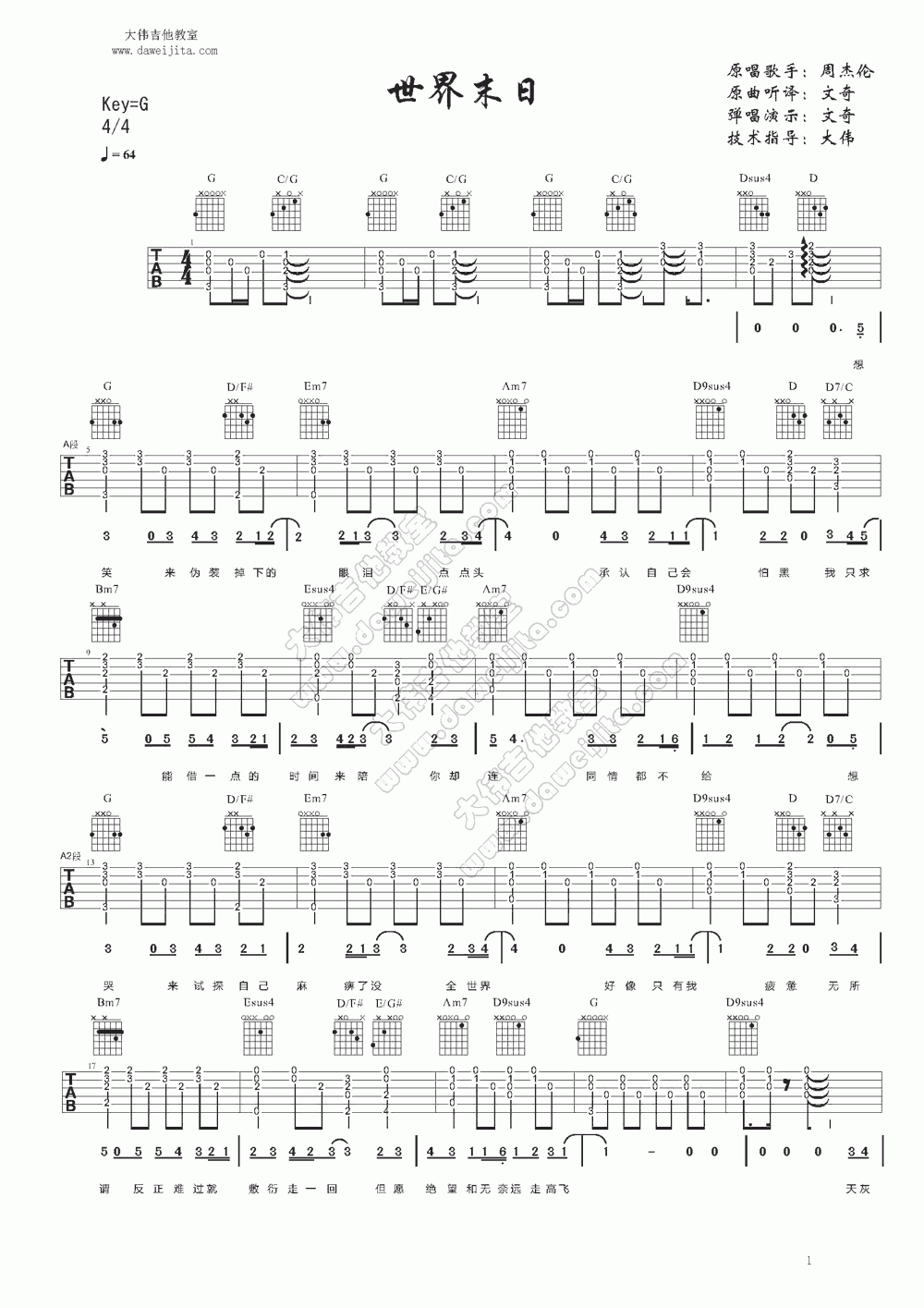 曲谱介绍: 周杰伦《世界末日》吉他弹唱谱,采用G调指法编配,共有2张高清图谱,免翻页排版设计。
