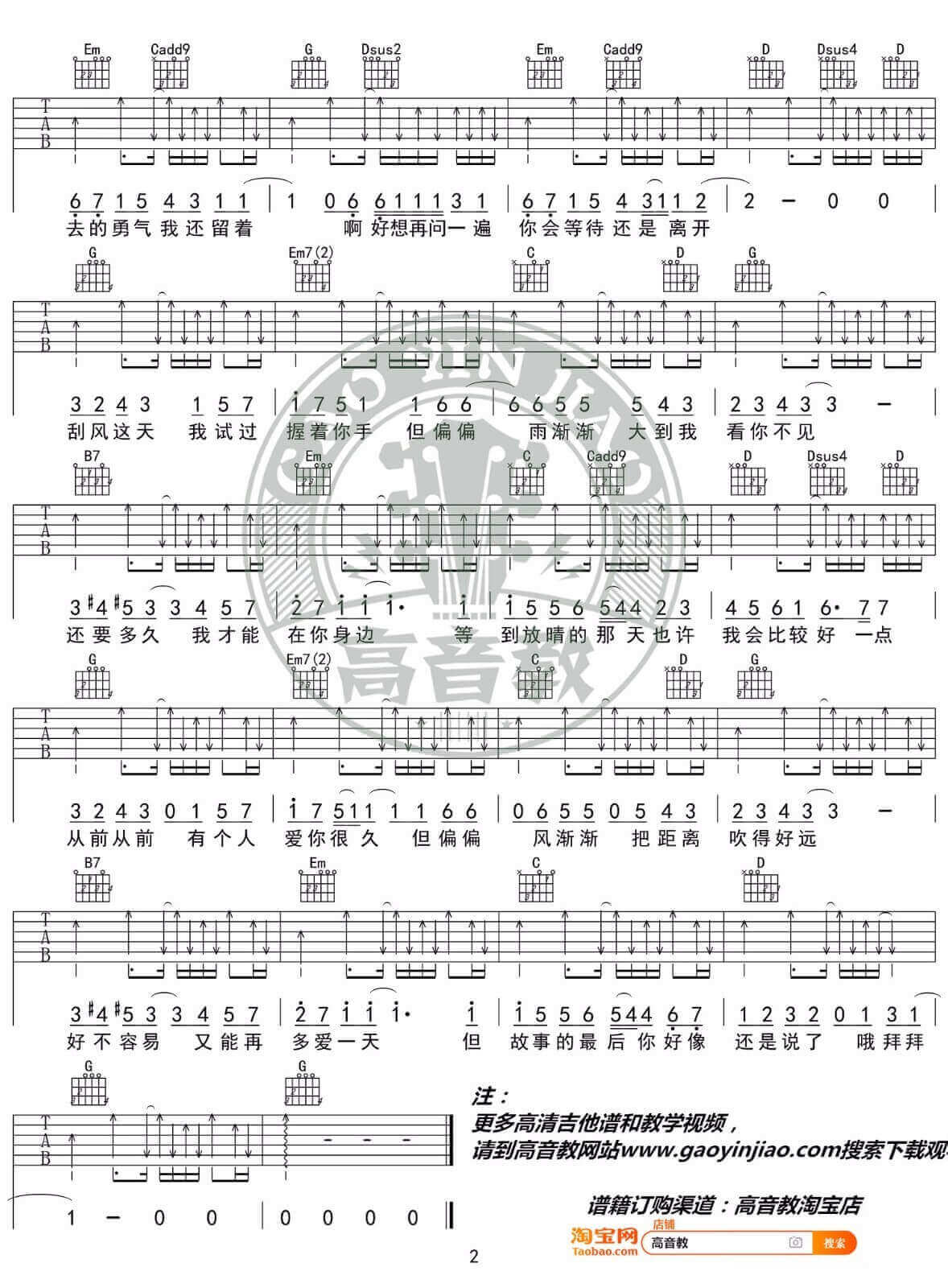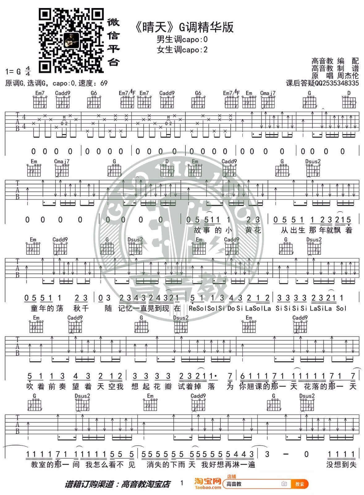 曲谱介绍: 晴天吉他谱_周杰伦_《晴天》G调原版弹唱谱_高清图片六线谱分享,《晴天》这首歌是由周杰伦创作并演唱的一首经典歌曲,收录在2003年发行的《叶惠美》专辑中,是一首浪漫的少年情歌,有风花雪月,更多的是怅然若失,很散文诗式的情怀,略带伤感。曲谱来源于高音教,这里歌曲原调G调进行原版编配,无需夹变调夹演唱。 晴天吉他谱_周杰伦_《晴天》G调原版弹唱谱_高清图片六线谱1: