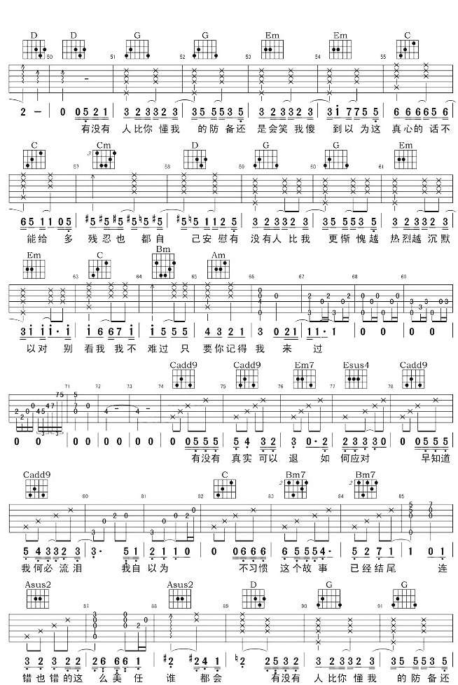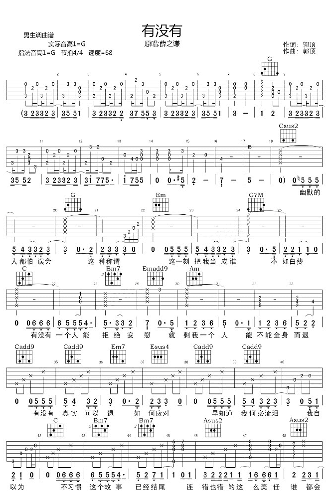 曲谱介绍: 有没有吉他谱_薛之谦_《有没有》G调原版弹唱谱_高清六线谱分享,《有没有》这首歌由灵魂段子手兼歌手薛之谦演唱。 此版本的曲谱来源于网络,版权归原作者所有。歌曲采用G调指法根据原版进行编配。练习这首歌的难点,在于前奏中含有大量的切分节奏,这个需要多注意,好好把握切分节奏的使用,其他整体比较简单。 有没有吉他谱_薛之谦_《有没有》G调原版弹唱谱_高清六线谱1-2: