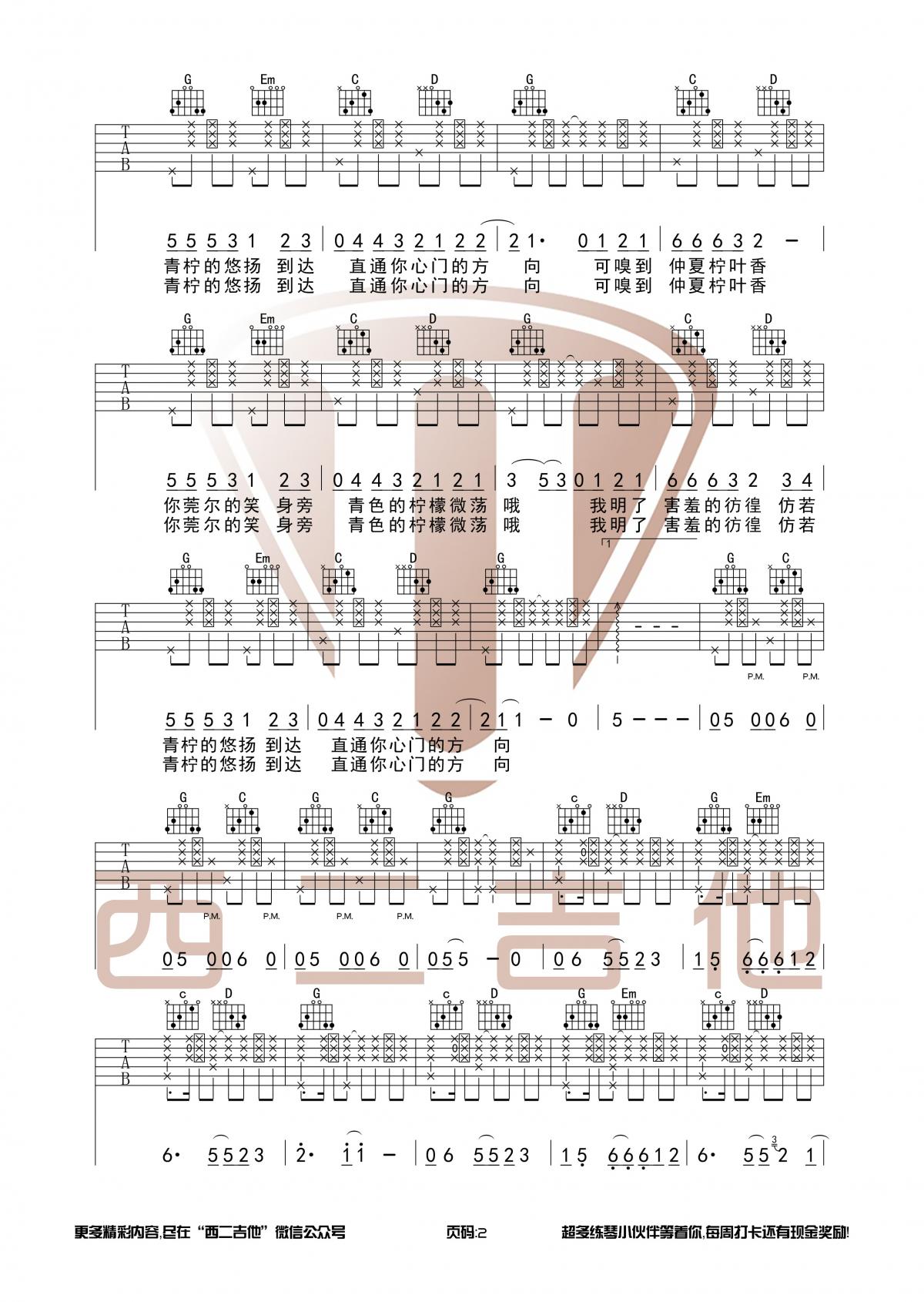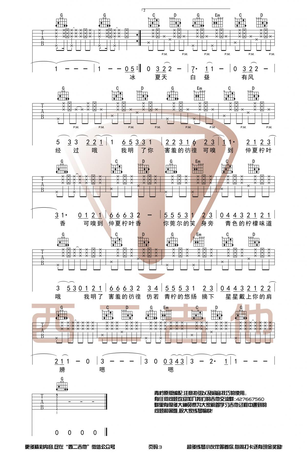曲谱介绍: 徐秉龙/桃十五《青柠》吉他弹唱谱,采用G调指法编配原版,共有3张高清图谱。