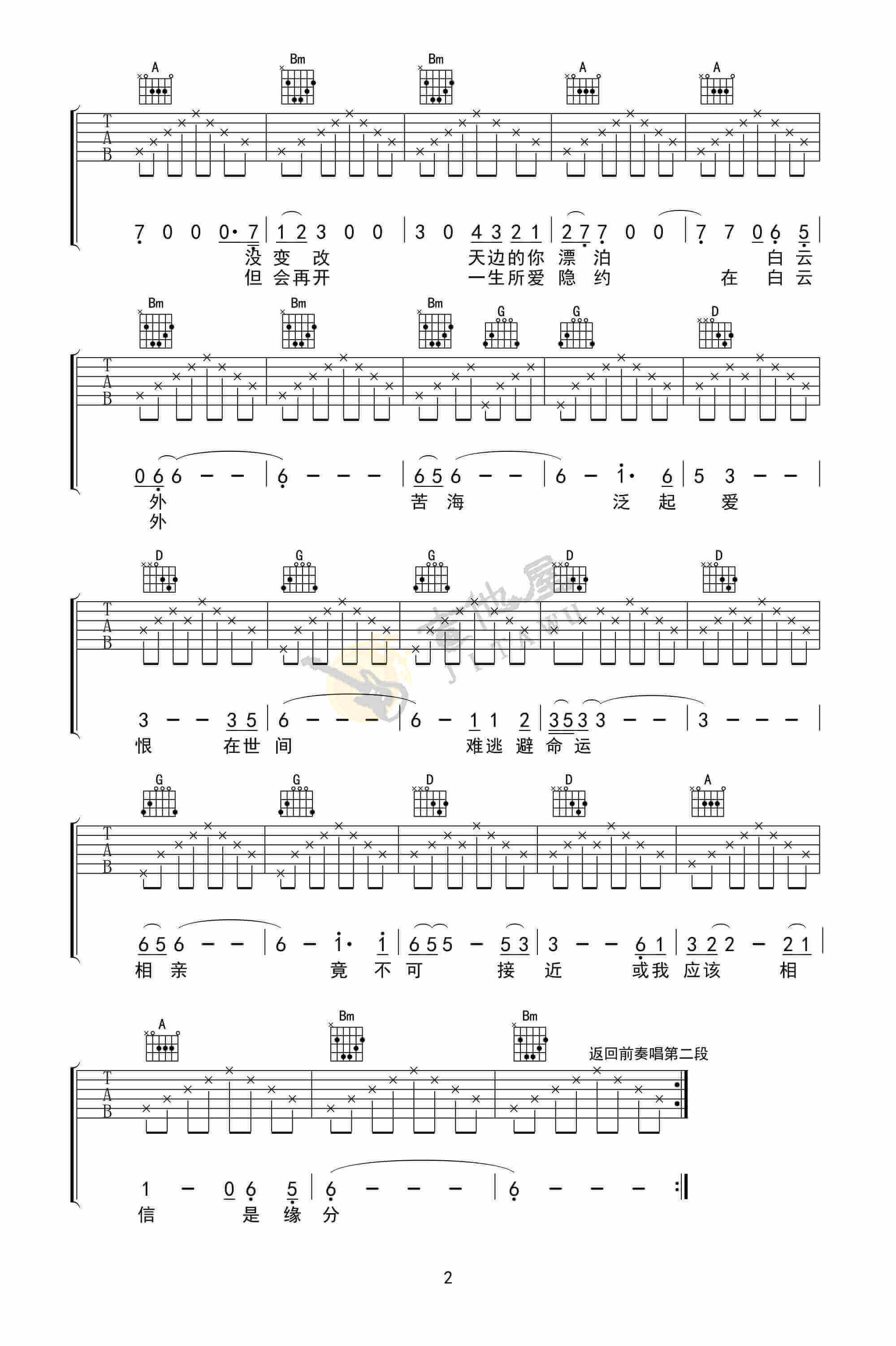 曲谱介绍: 卢冠廷《一生所爱》D调简单版吉他弹唱六线谱_高清图片谱分享,此版本的曲谱为采用D调指法编配的简单版吉他谱,全曲没有太生僻的和弦,和弦走向也是很常用的,只有#Fm和Bm和弦两个大横按对新手朋友们来说可能会有些难度,最后的副歌部分,有兴趣的话可以自己换成扫弦的节奏型,说不定效果更好哦! 卢冠廷《一生所爱》D调简单版吉他弹唱六线谱_高清图片谱1: