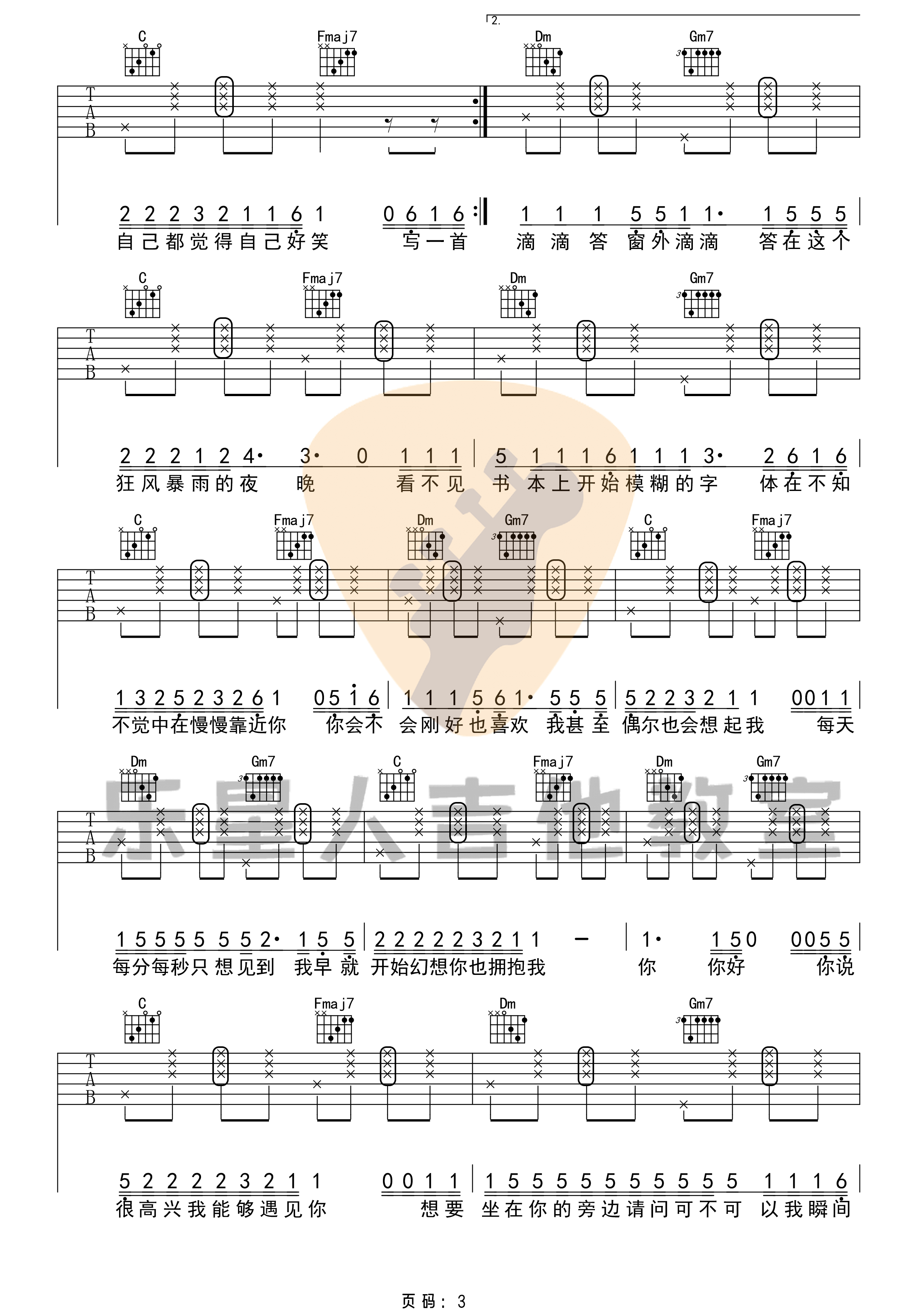 曲谱介绍: 《零几年听的情歌》吉他谱_AY杨佬叁_F调原版弹唱谱_高清六线谱分享,《零几年听的情歌》是由AY杨佬叁创作并演唱的一首rap,这是一首非常甜的歌曲,甜而不腻还带点俏皮,舒适感满分,很适合表白的一首歌。 此版本的曲谱来源于乐星人吉他教室扒谱制谱,歌曲原调为#F调,这里采用了F调指法根据原版进行编配,演唱时夹变调夹1品回到原调。曲谱编配有一定难度,F调的一些和弦比较难按,但其中所使用的节奏型还是十分简单的。 《零几年听的情歌》吉他谱_AY杨佬叁_F调原版弹唱谱_高清六线谱1-2:
