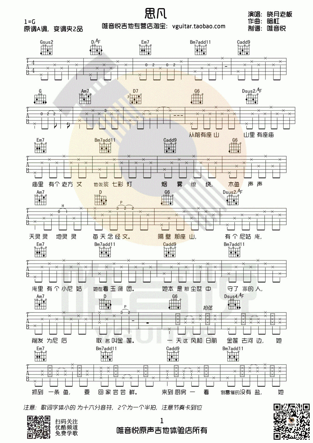 曲谱介绍: 晓月老板《思凡》吉他弹唱谱,采用G调指法编配,共有3张高清图谱。