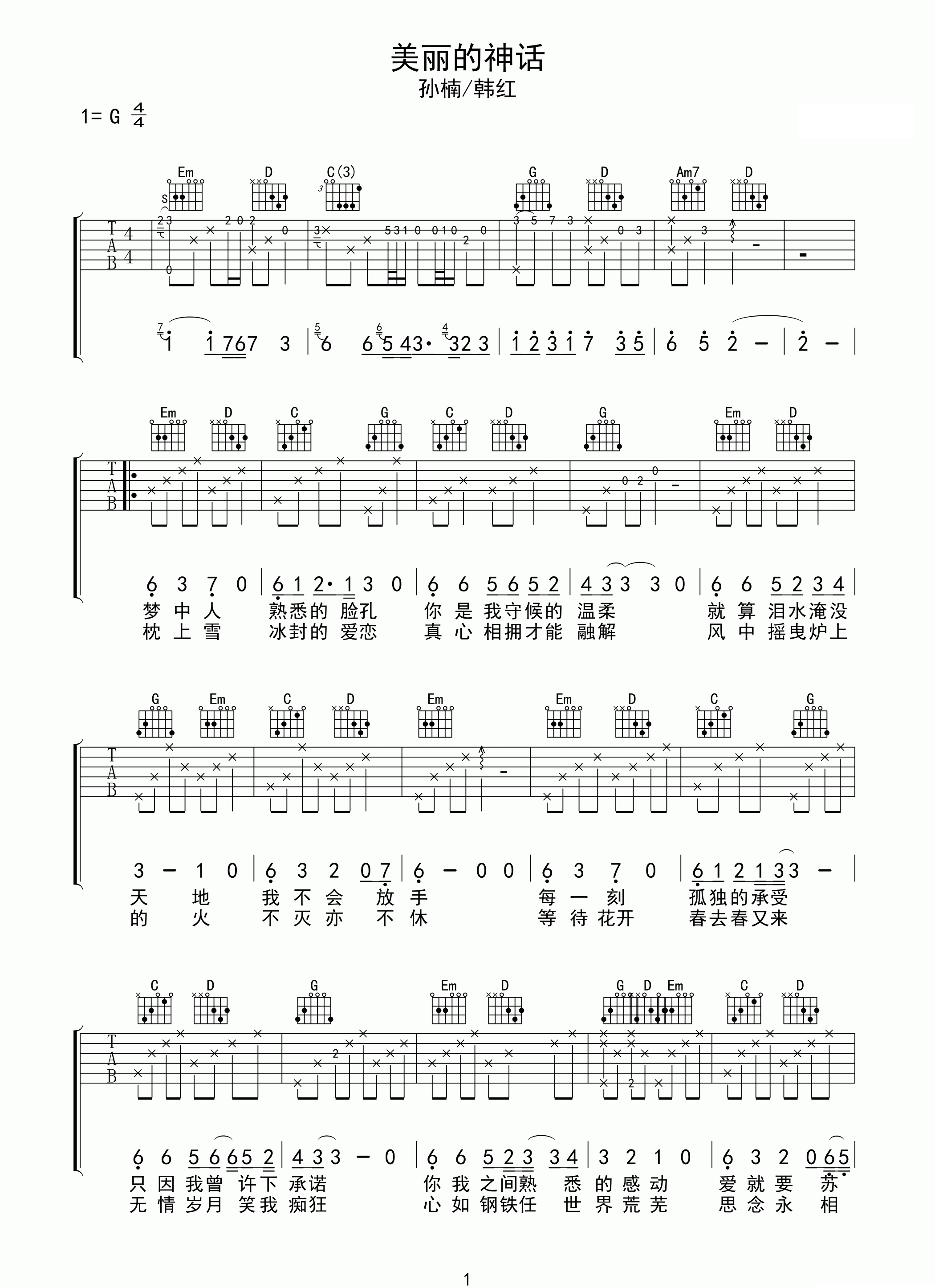 美丽的神话吉他谱 - 孙楠/韩红 - G调吉他弹唱谱 - 原版
