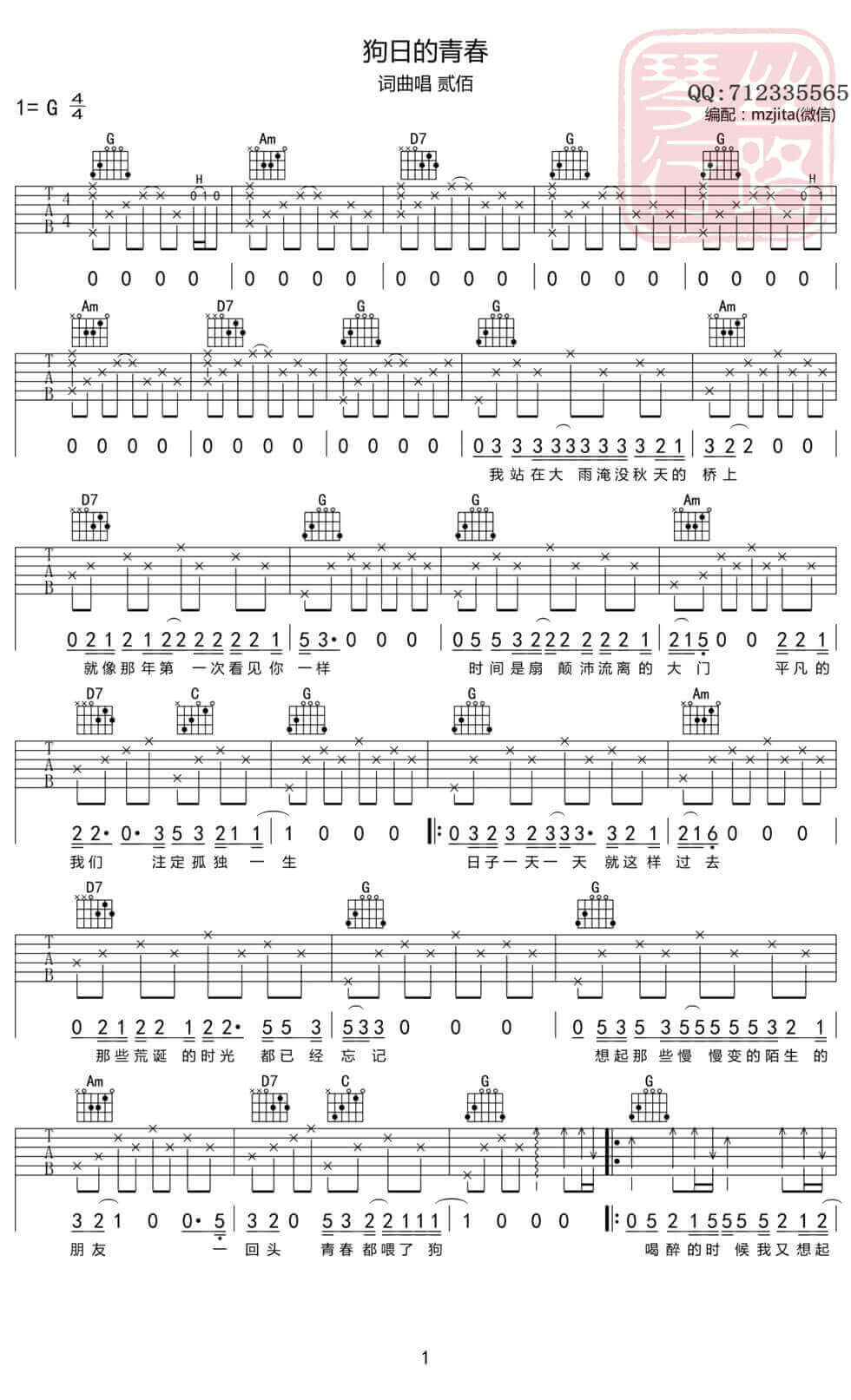 狗日的青春吉他谱 - 贰佰 - G调吉他弹唱谱 - 原版