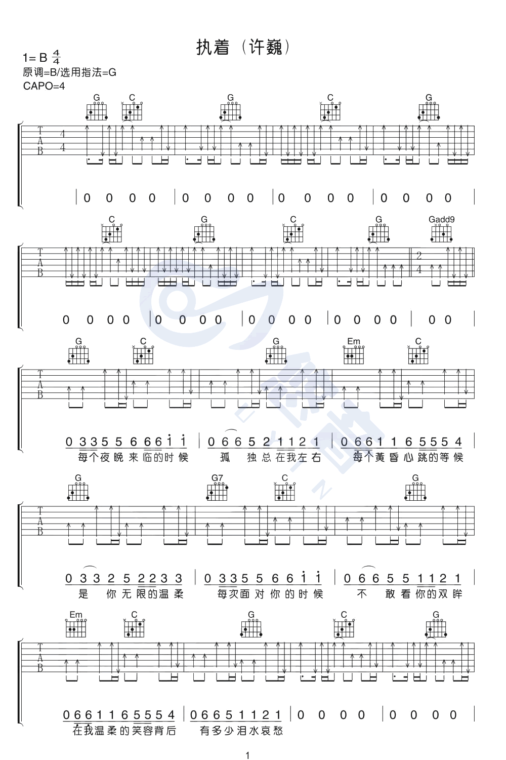 曲谱介绍: 执着吉他谱_许巍_《执着》G调原版六线谱_吉他弹唱教学分享,《执着》是一首非常老的歌曲,这还是许巍刚开始自学音乐的时候写的一首歌,原唱为田震,后许巍也自己唱了这首歌收录在自己1997年的专辑中。 此版本的曲谱及教学来源于悠音吉他,歌曲原调为B调,这里采用G调指法根据原版进行编配,演唱时夹变调夹4品回到原调。这首歌采用全扫弦的形式编配,和弦的选择上非常简单,但带附点的节奏型稍微复杂一些。 执着吉他谱_许巍_《执着》G调原版六线谱_吉他弹唱教学视频: 吉他弹唱演示及视频教学 执着吉他谱_许巍_《执着》G调原版吉他弹唱六线谱_高清图片谱1-2: