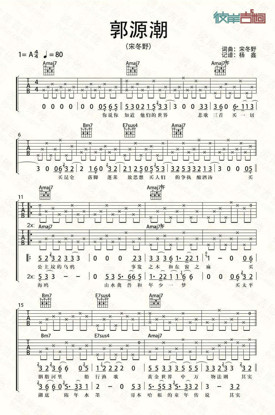 郭源潮吉他谱 - 宋冬野 - A调吉他弹唱谱