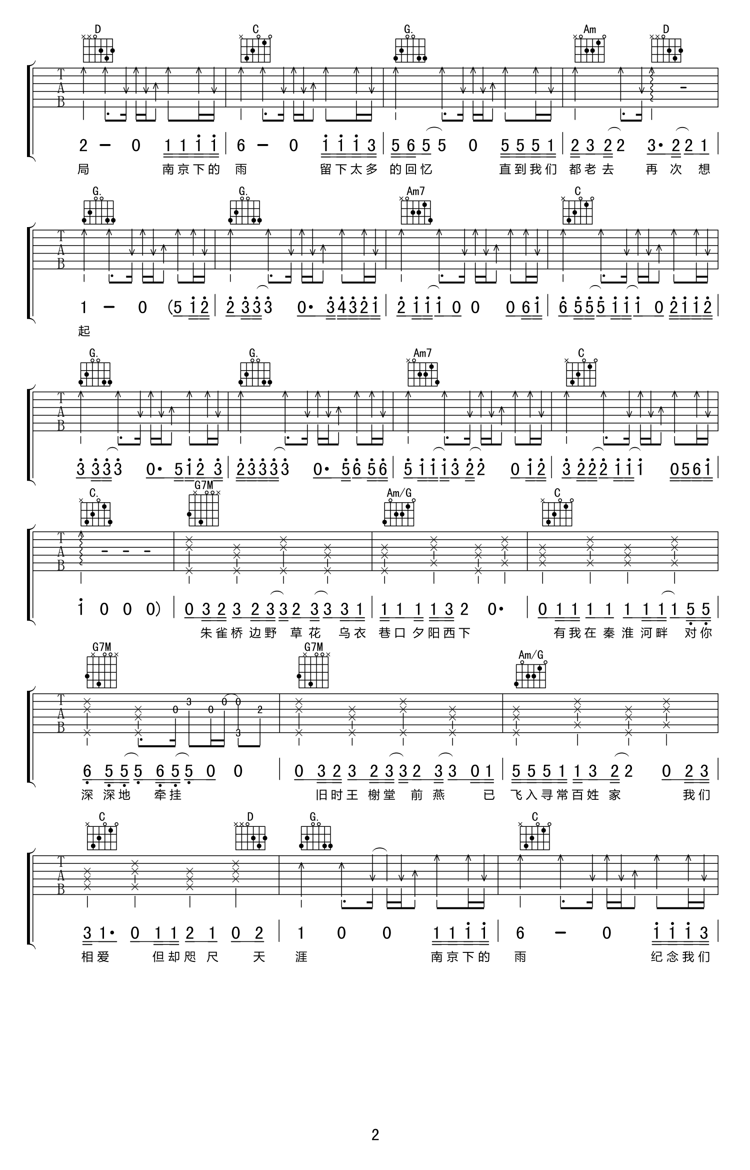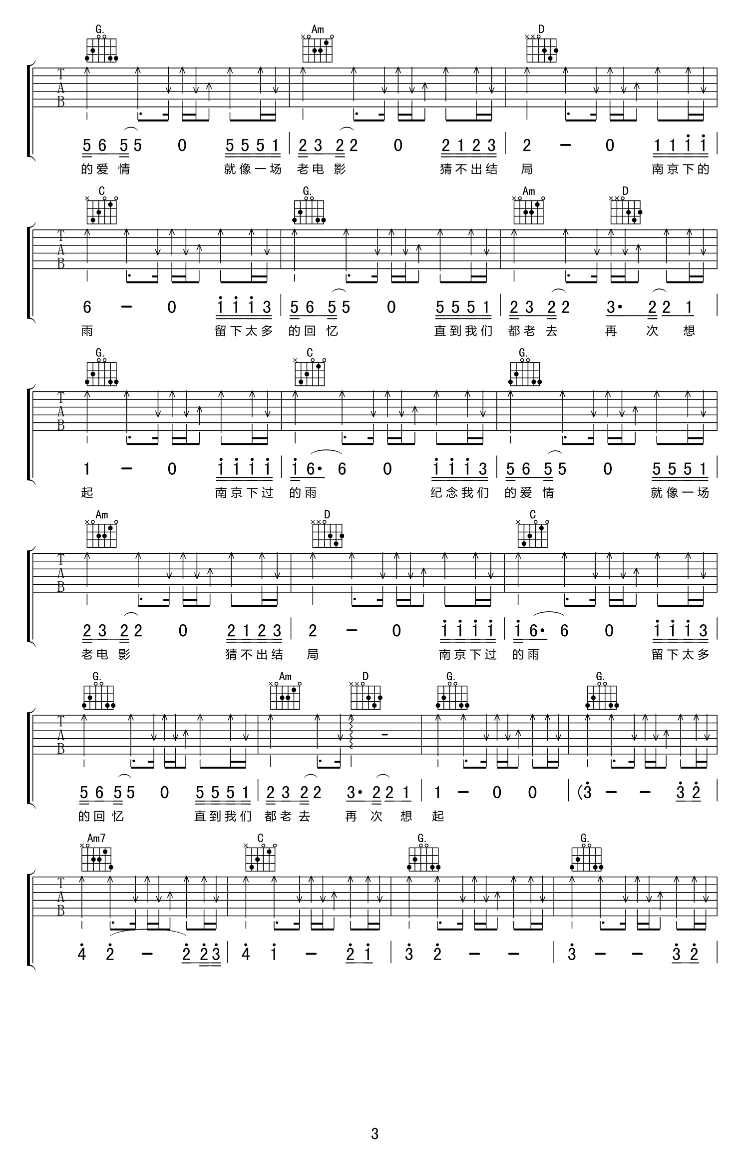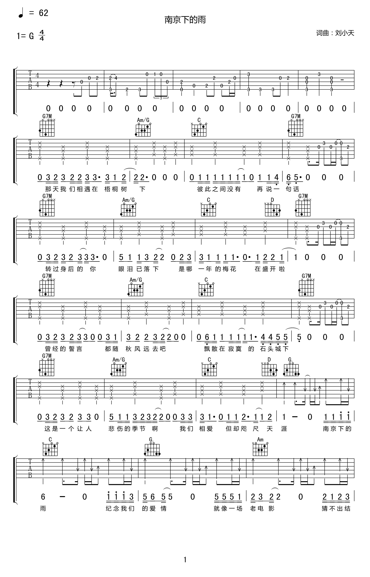 南京下的雨吉他谱 - 刘小天 - G调吉他弹唱谱
