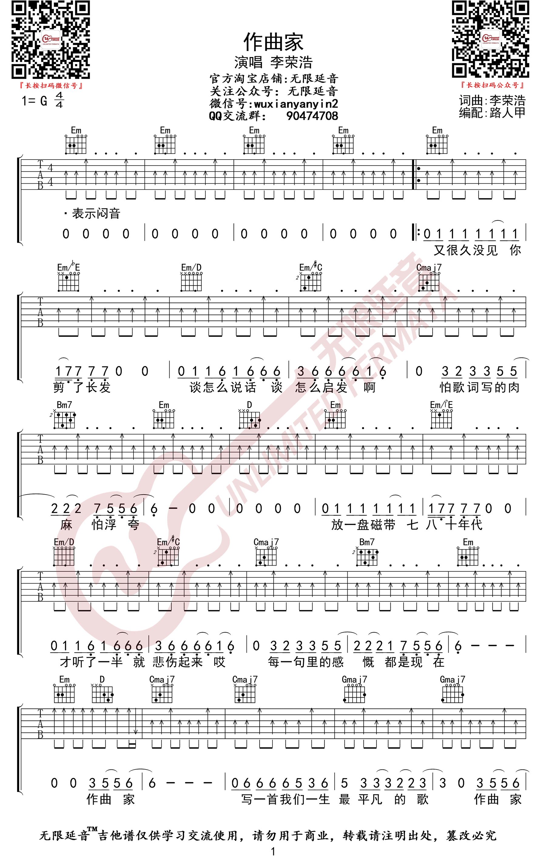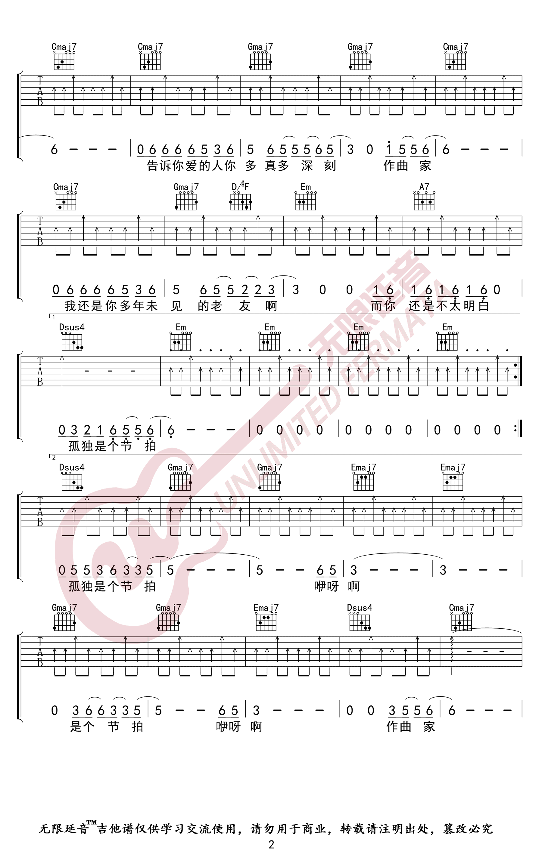 曲谱介绍: 作曲家吉他谱_李荣浩_《作曲家》G调原版弹唱谱_高清六线谱分享,《作曲家》是由李荣浩创作并演唱的一首歌,这首歌流行摇滚风格浓烈,在编曲上,通过钢琴与鼓点的交错,令听众感受到自己久违的心跳,并获得挣脱桎梏后,自由天性的释放。从这首歌略带自传性质的歌词中,听众能窥见李荣浩内心关于音乐创作的态度:“音符不会写/写歌是感觉/理论书上的观点有缺陷”,真正的创作高手向来都是无招剩有招,有时候就是那个感觉。