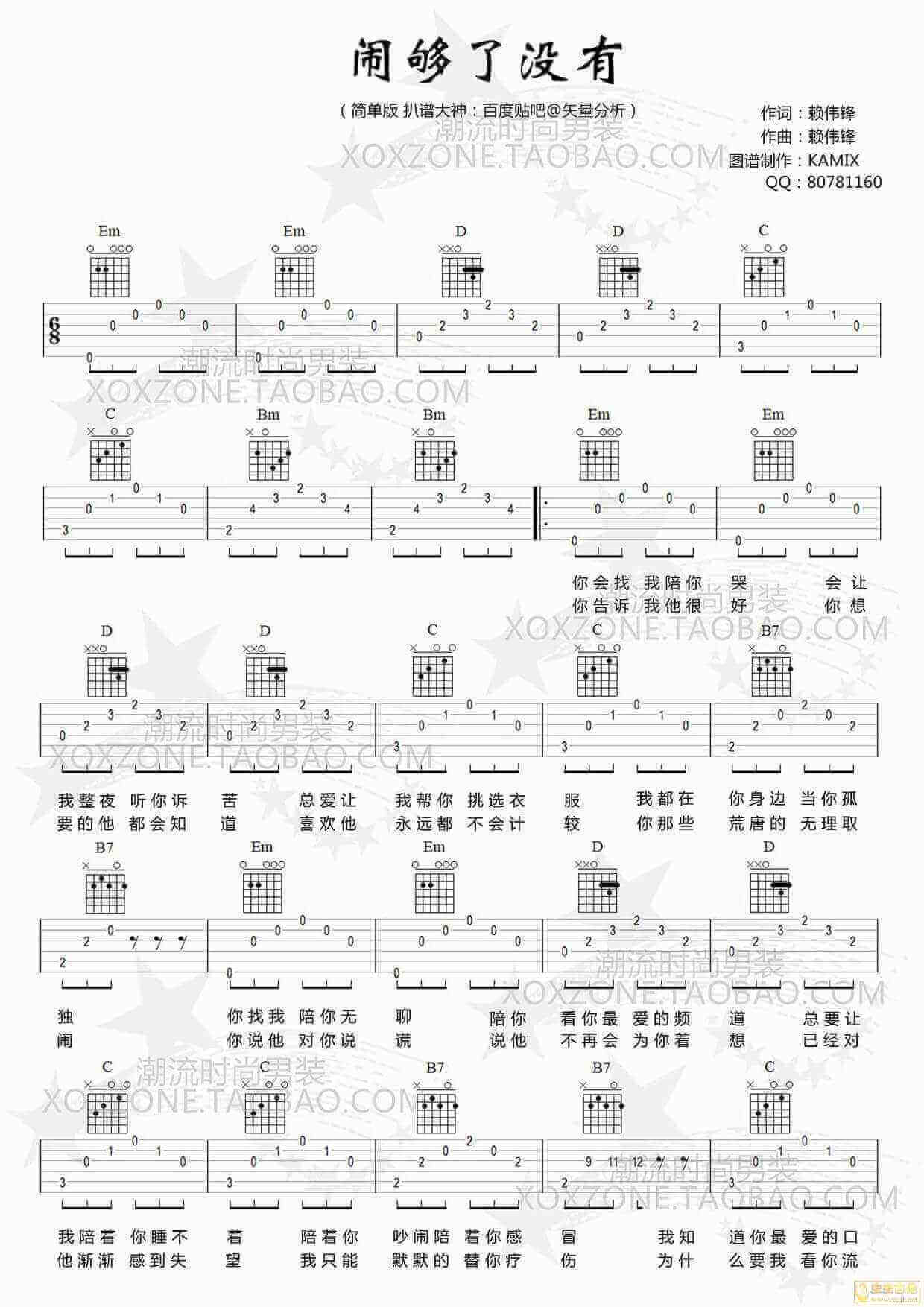 曲谱介绍: 《闹够了没有》吉他谱_赖伟锋_G调简单版弹唱谱_高清六线谱分享,《闹够了没有》是由赖伟锋作词、作曲并演唱的一首歌,歌曲最具特色的地方在于它的歌词比较的简单直白,把歌者从暗恋一个人,到做他最好的朋友,到最后沦为备胎的经历与内心的心力交瘁表达的明明白白,触动了不少人的内心。