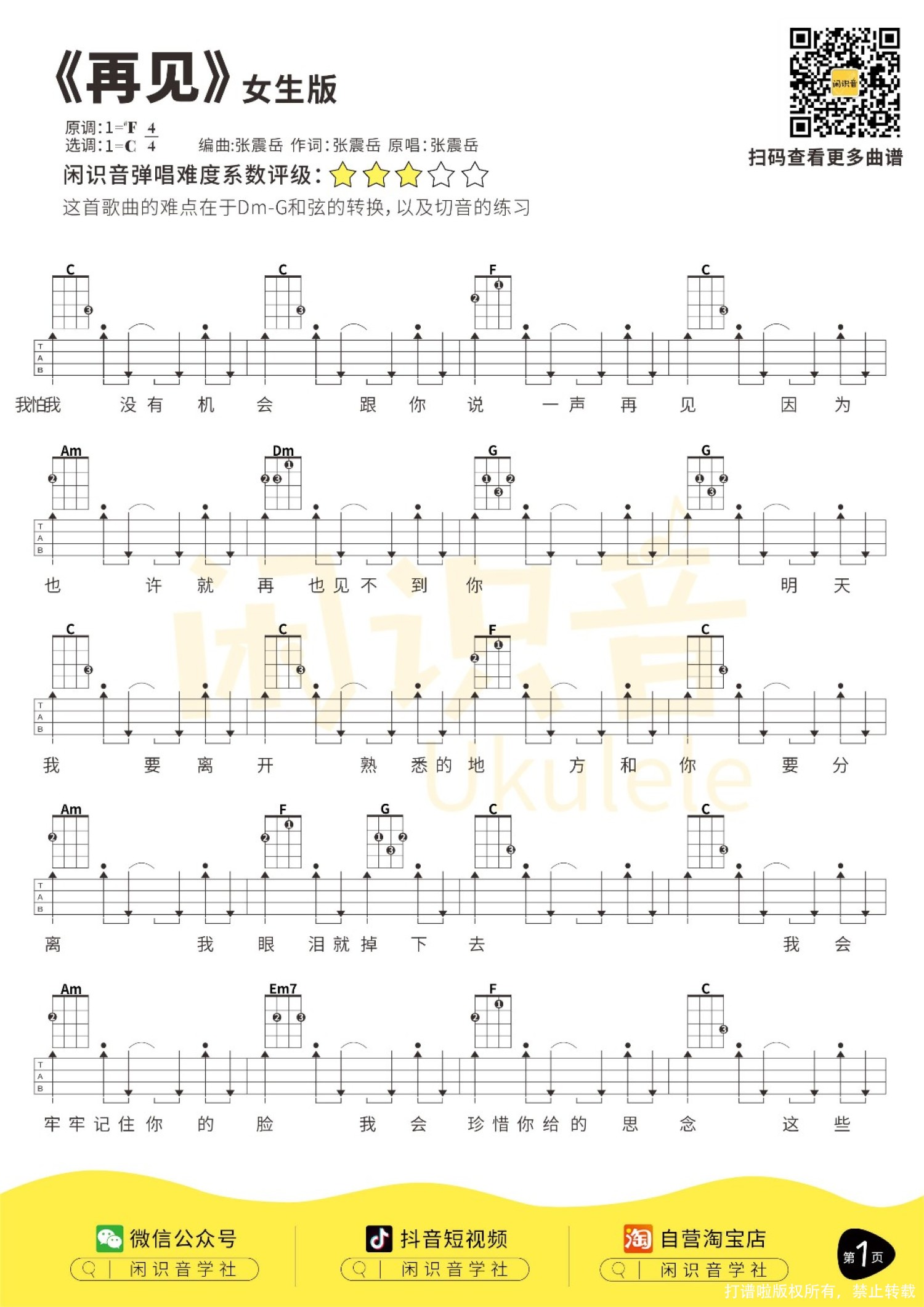曲谱介绍: 张震岳《再见》_C调尤克里里谱_女生版