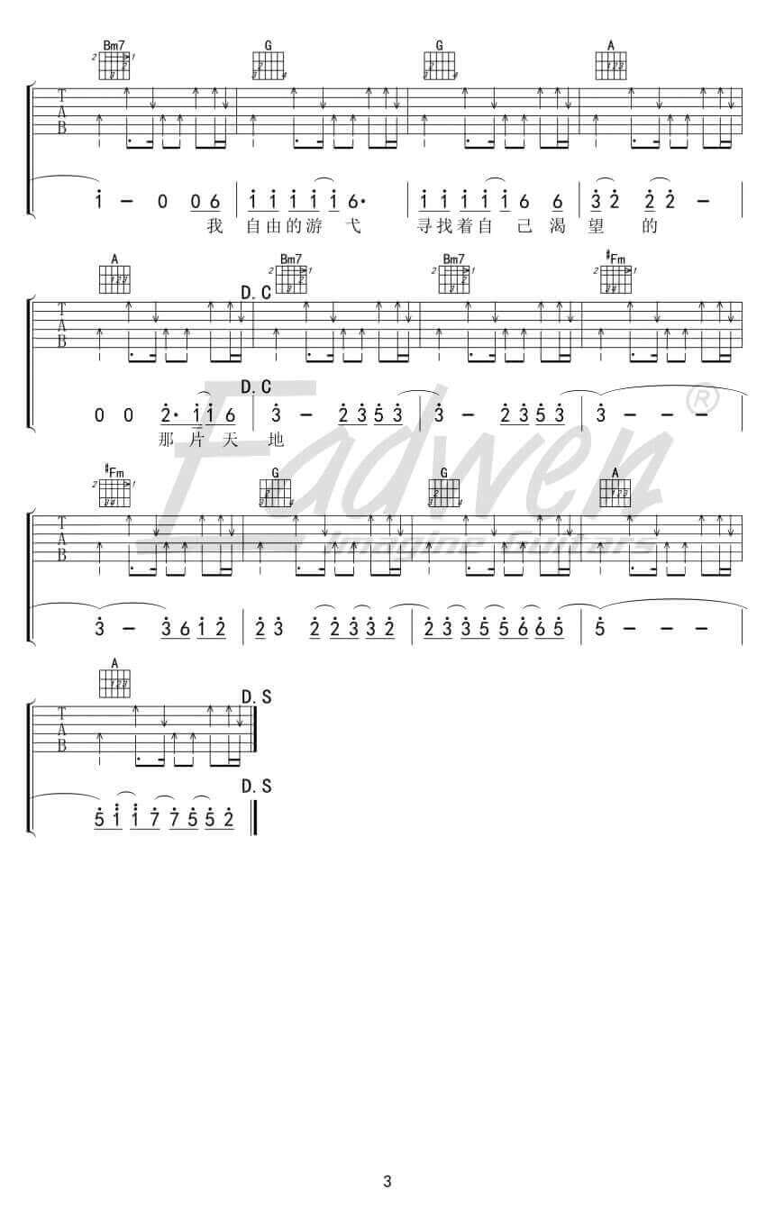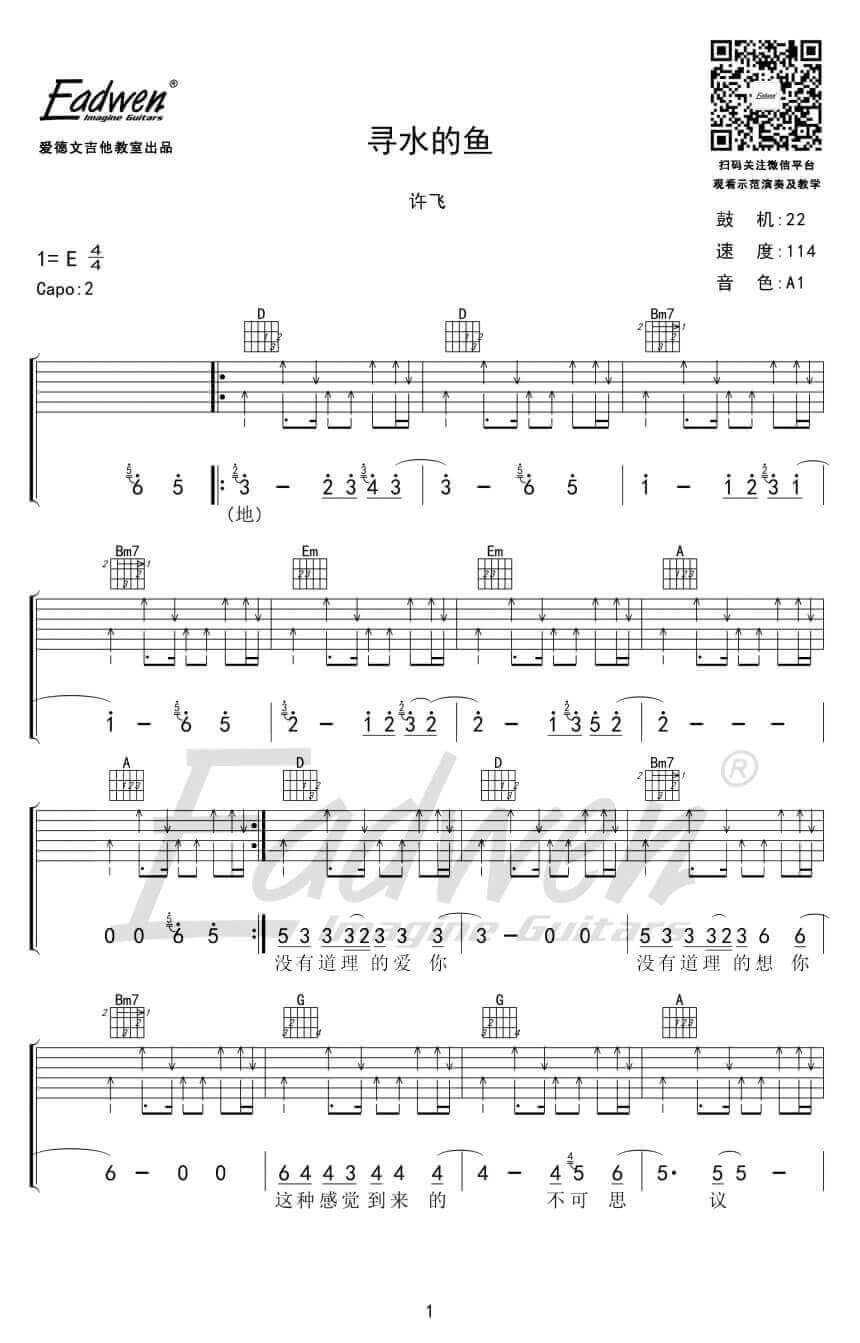 曲谱介绍: 《寻水的鱼》吉他谱_许飞_D调弹唱六线谱_高清图片谱分享,《寻水的鱼》是由许飞演唱的一首歌曲,这首歌从歌名上看,感觉应该是首很悲伤舒缓的歌曲,但是这首歌中,许飞首度尝试了“轻摇滚”曲风,轻快地节奏,让原本有些忧郁的歌词多了些豁然。自从进入部队以后,许飞的音乐就有了一些微妙的变化,多了一些豪气和坚毅,充满了正能量。正如这一首《寻水的鱼》所唱的那样:“我自由的游弋,寻找着自己渴望的那片天地”。