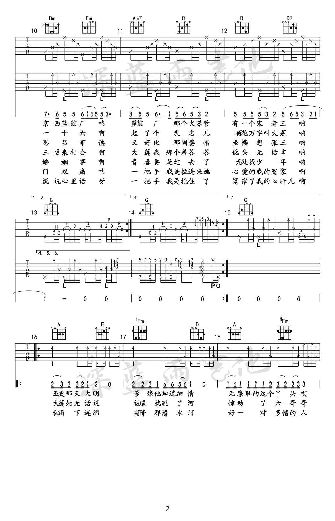 曲谱介绍: 探清水河吉他谱_晓月老板_《探清水河》G转A调弹唱谱_原版六线谱分享,这是一首来自晓月老板演唱的《探清水河》,一首歌词给人十分凄美感觉的京味儿小曲儿,德云社张云雷也曾经演唱过。此版本的曲谱来源于深蓝雨吉他,采用G调指法编配,但最后由G转为A调变成A调和弦,演唱时男生建议0-2品,女生5-7品。 探清水河吉他谱_晓月老板_《探清水河》G转A调弹唱谱_原版六线谱1: