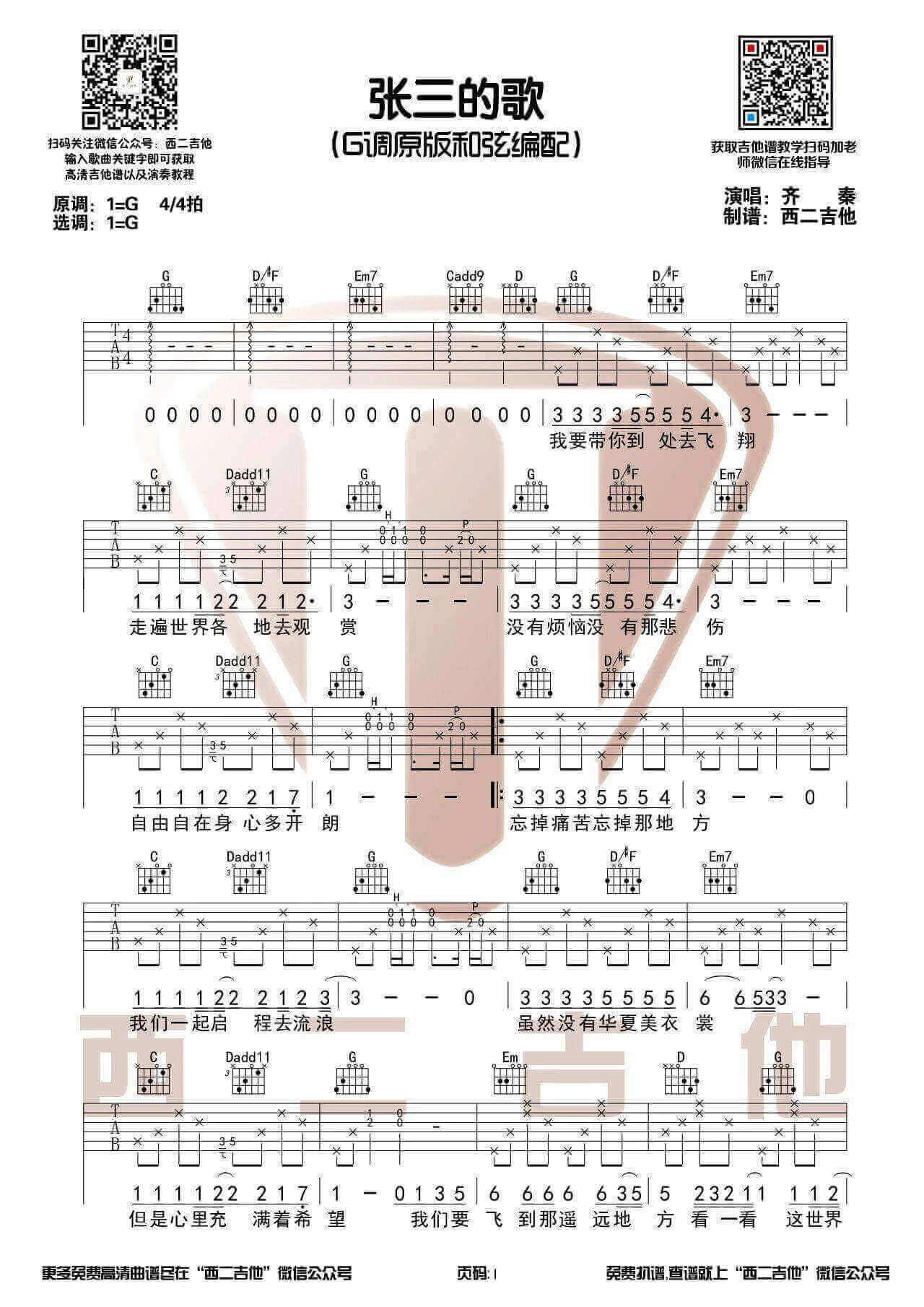 曲谱介绍: 张三的歌吉他谱_齐秦_《张三的歌》G调六线谱_吉他弹唱教学分享,《张三的歌》是由张子石作词、作曲,李寿全演唱的歌曲,齐秦翻唱,这首歌也是1986年出品的电影《父子关系》的主题曲。齐秦重新演绎这首经典名曲用他的人生阅历和情感扮演你和我,唱出每个人心底角落的那个声音,让人们在艰辛的生活中要一直保有希望,每一句的歌声都浑然天成的自动到位,堪称完美歌王。 吉他弹唱演示及视频教学