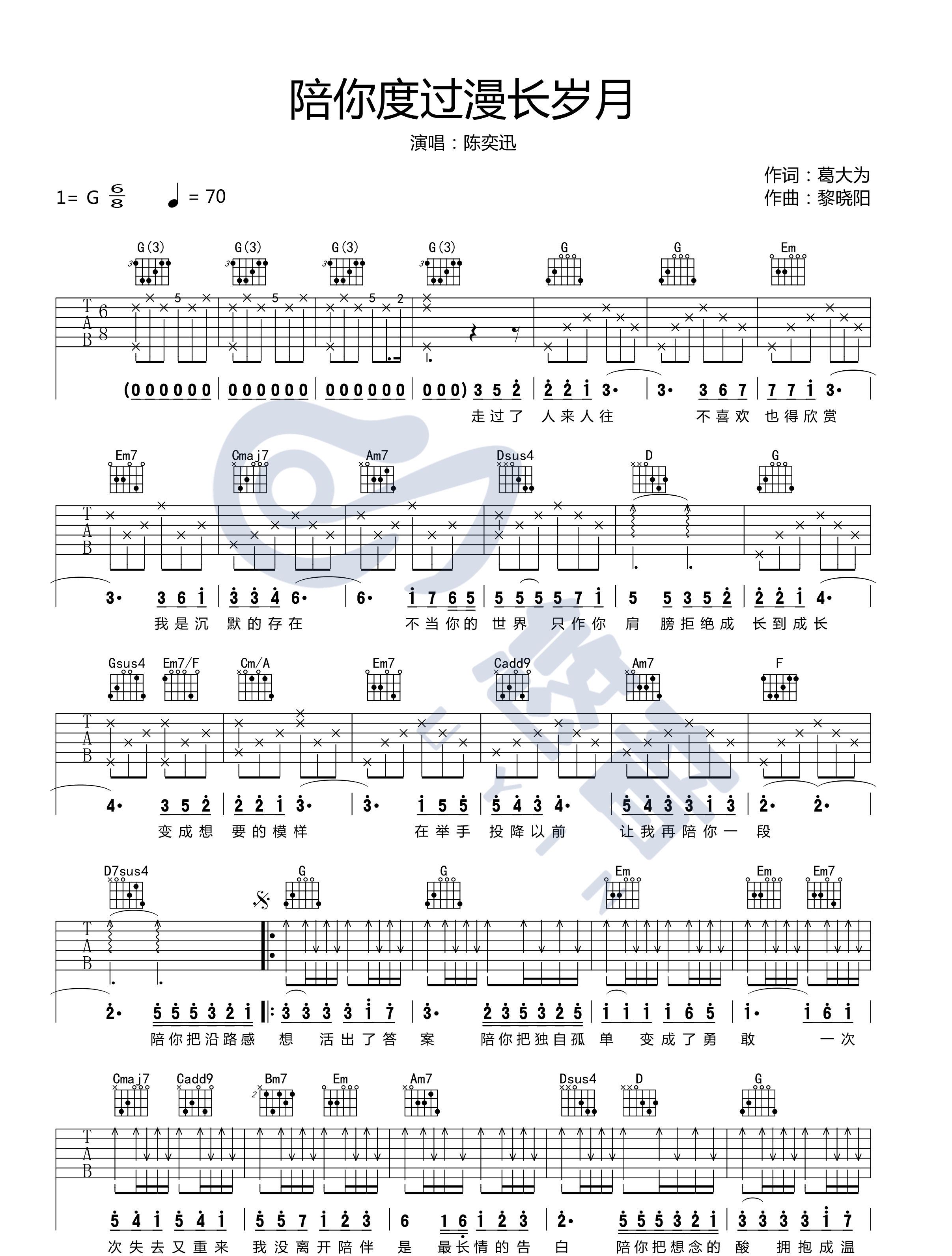 曲谱介绍: 《陪你度过漫长岁月》吉他谱_陈奕迅_G调六线谱_吉他弹唱教学视频: 吉他弹唱演示及视频教学 《陪你度过漫长岁月》吉他谱_陈奕迅_G调六线谱_吉他弹唱教学分享,《陪你度过漫长岁月》是由陈奕迅演唱的一首经典歌曲,这首歌也是作为了电影《陪安东尼度过漫长岁月》的中主题曲,非常耐听的一首歌。 此版本的曲谱及教学来源于悠音吉他出品,这里歌曲采用了G调指法根据原版进行编配,演唱时可根据自己的嗓音情况夹变调夹。这首歌编配的和弦还算是比较简单,但节奏相对来说较为复杂,不懂的可以参考吉他弹唱教学视频。 《陪你度过漫长岁月》吉他谱_陈奕迅_G调吉他弹唱六线谱_高清图片谱1: