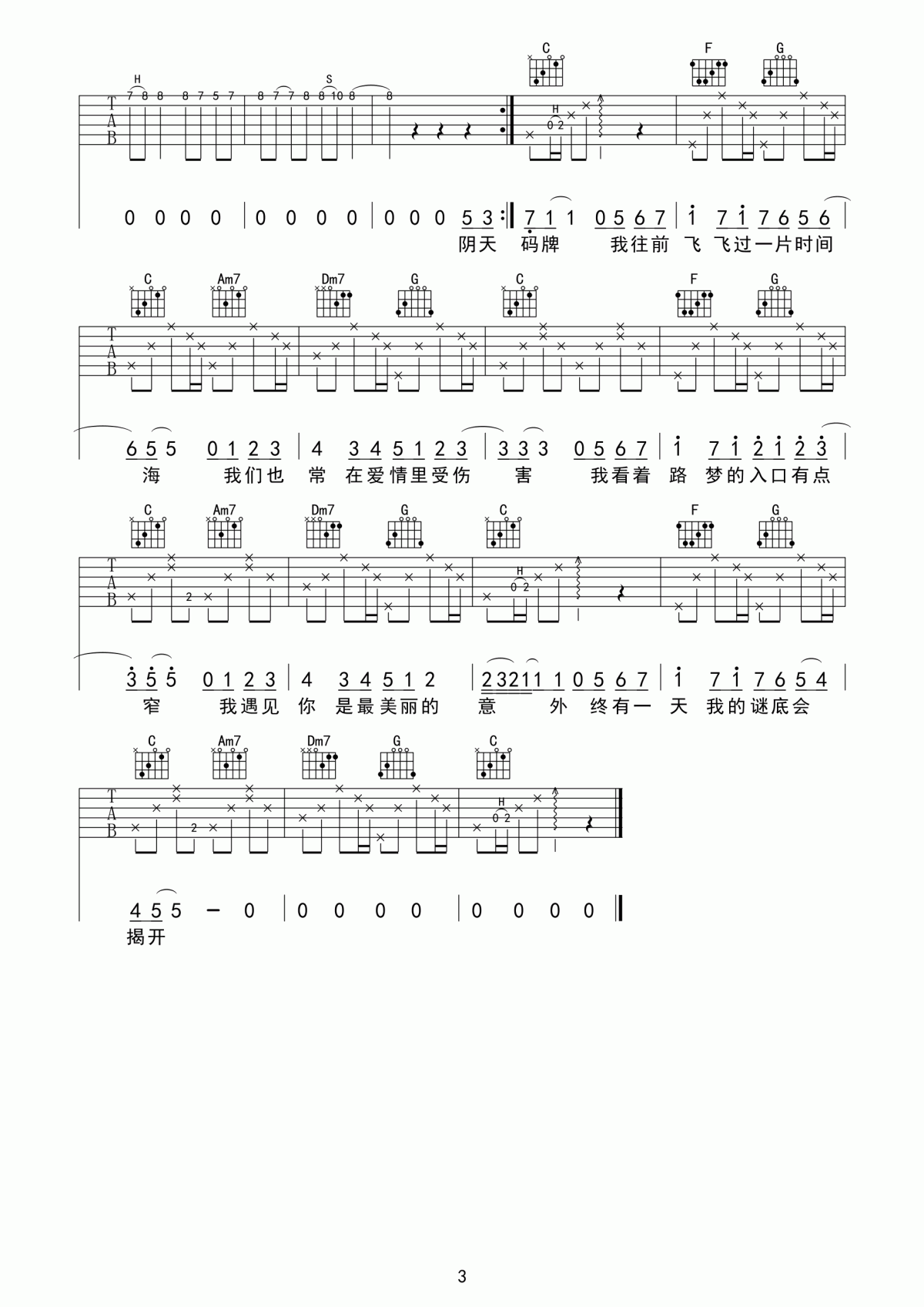 曲谱介绍: 《遇见》吉他弹唱谱,采用F调指法编配,共有3张高清图谱。