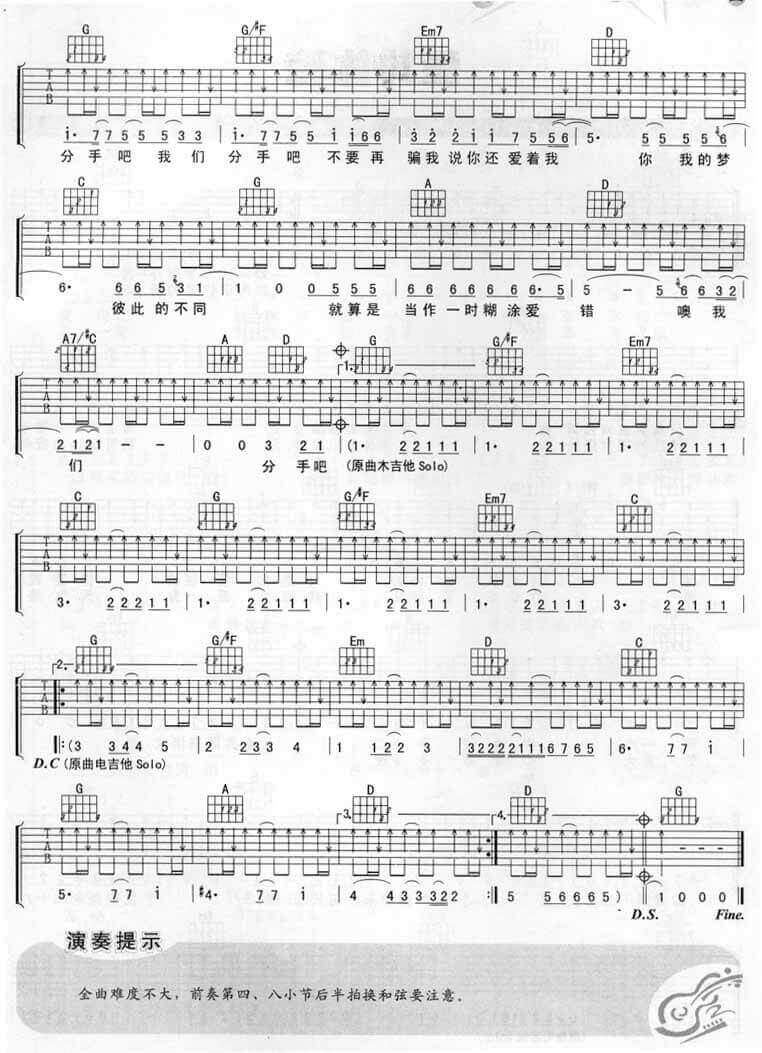 曲谱介绍: 分手吧吉他谱_张震岳_《分手吧》G调弹唱六线谱_高清图片谱分享,《分手吧》是由张震岳演唱的一首歌。