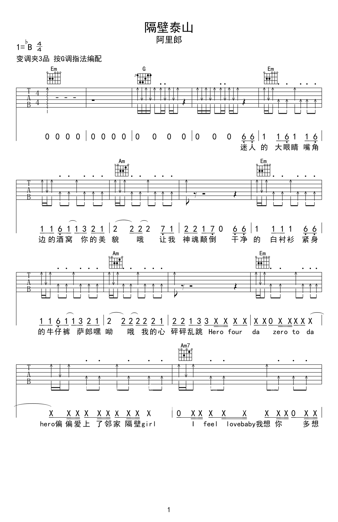 曲谱介绍: 《隔壁泰山》吉他谱_阿里郎_G调原版弹唱六线谱_高清图片谱分享,《隔壁泰山》是由崔金水、美罗作词,美罗、权赫作曲,阿里郎组合演唱的歌曲,《隔壁泰山》真的是洗脑神曲,第一次听真的觉得太喜感,然而,人们总是逃不过“真香”定律,第三遍的时候已经跟着哼起来了。最让人意外和喜欢这首歌的是在《青春有你》这个节目中的改编,配上帅气的舞蹈,这首歌的风格又变了,泰山也可以很帅很迷人。