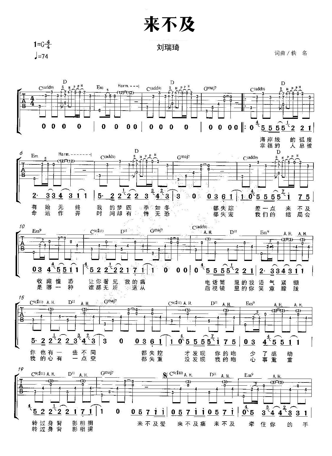 曲谱介绍: 来不及吉他谱_刘瑞琦_《来不及》G调弹唱六线谱_高清图片谱分享,《来不及》是刘瑞琦演唱的一首歌曲,这首歌大概是在跟我们述说一个关于时间只够遇见,却来不及的相爱的爱情故事吧。听这首《来不及》希望能够好好珍惜现在,趁现在就去勇敢吧。