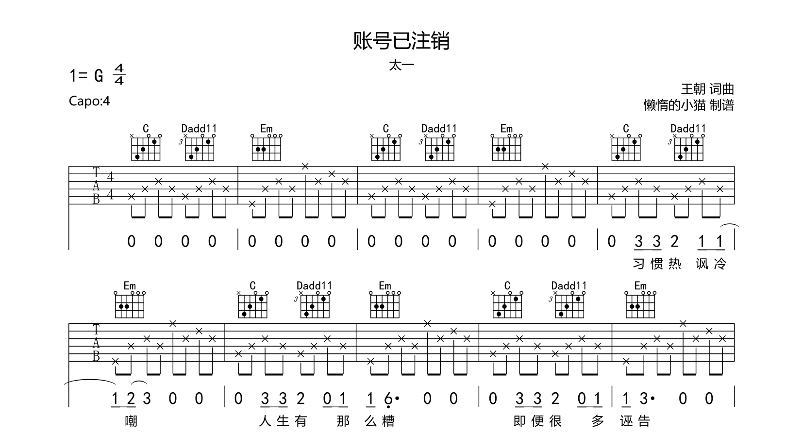 账号已注销吉他谱 - 太一 - G调吉他弹唱谱
