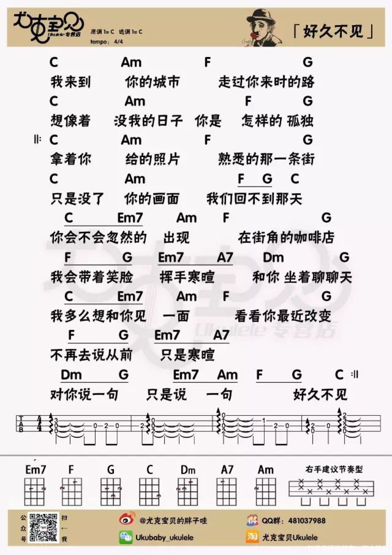 曲谱介绍: 回忆、过去、灰色、伤感的调,让人百感交集的词,陈奕迅——《好久不见》。多的介绍说不出来了。下面给个简单的视频参考(又是那个Mary姐姐),最后会给出好久不见ukulele谱:右手节奏前面的分解和弦:43231323后面的扫弦:下-上下上下上总体来说非常简单,关键是要唱得好听。